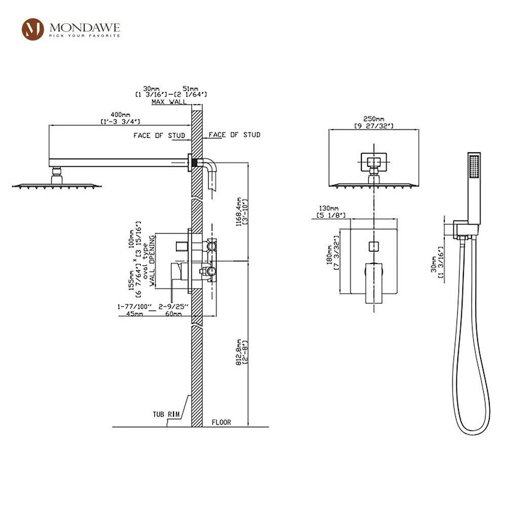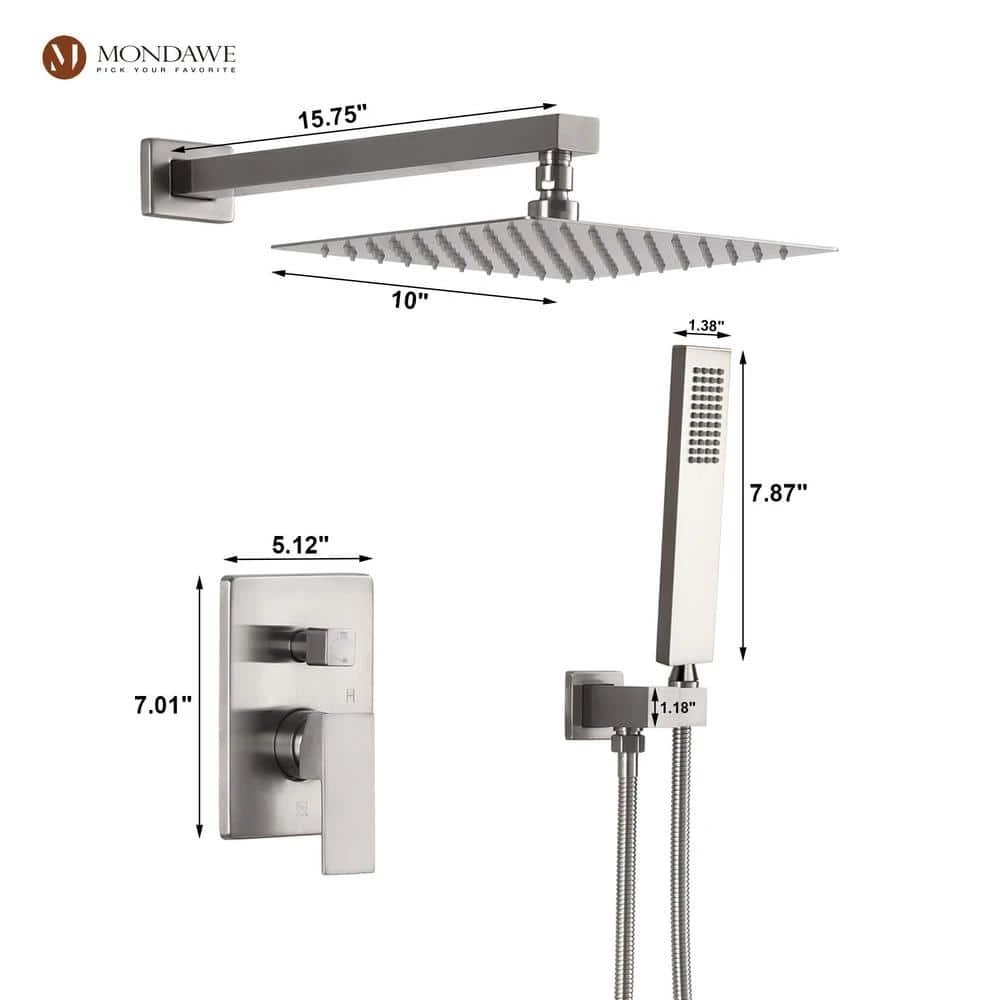 The Tub Shower Faucet with Valve and Shower Head Systems offers a sophisticated wall-mounted shower combo set for your bathroom. It includes a durable 10 in. stainless steel 304-shower head, a matching stainless steel shower arm, and an ergonomic zinc alloy handle for smooth operation. The set also features a Brass handheld shower with a 59 in. hose for maximum flexibility, along with a sturdy brass holder for convenient storage. The wall connector ensures a secure and leak-free connection, enhancing the overall functionality of the shower faucet set. Overall, this shower combo set combines style, durability, and convenience, making it an excellent choice for any bathroom.