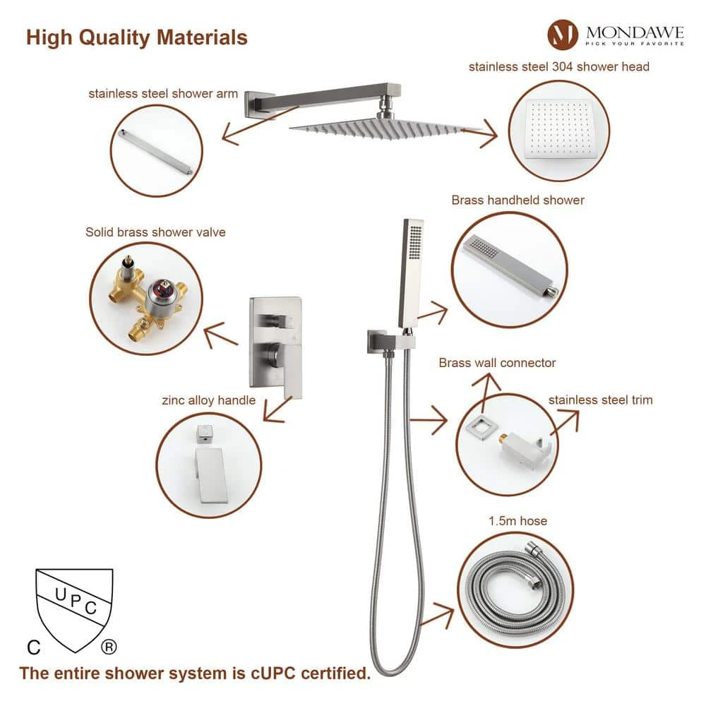 - Solid brass waterways, quality is essential, that’s why the shower system features solid brass waterways, recognized industry-wide as the best and most durable material for use in plumbing applications