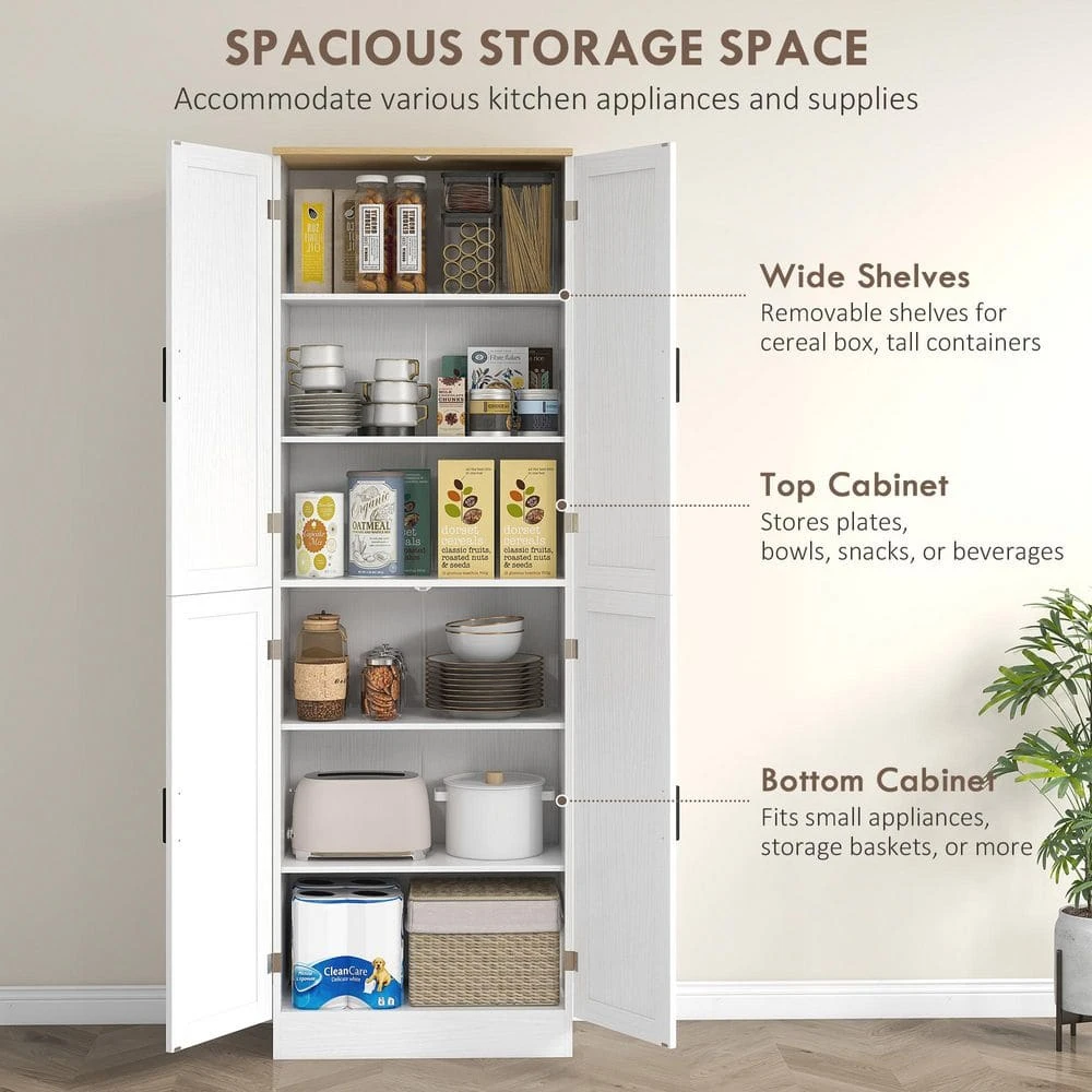 Are you still worried about the lack of kitchen space? HOMCOM kitchen cabinets are here! With 6 layers of large storage space, 4-doors to protect against dust, and 2-adjustable shelves, both large and small items can be properly placed. The stylish appearance with two-color matching and metal embellishments is both beautiful and functional; the anti-dumping design on the back protects the safety of your family. Easily expand the kitchen storage and decorate your home style.