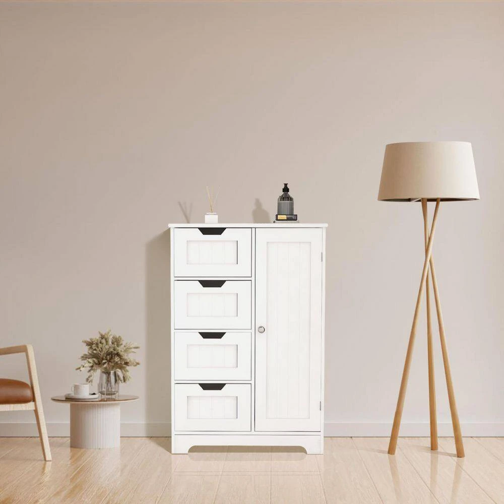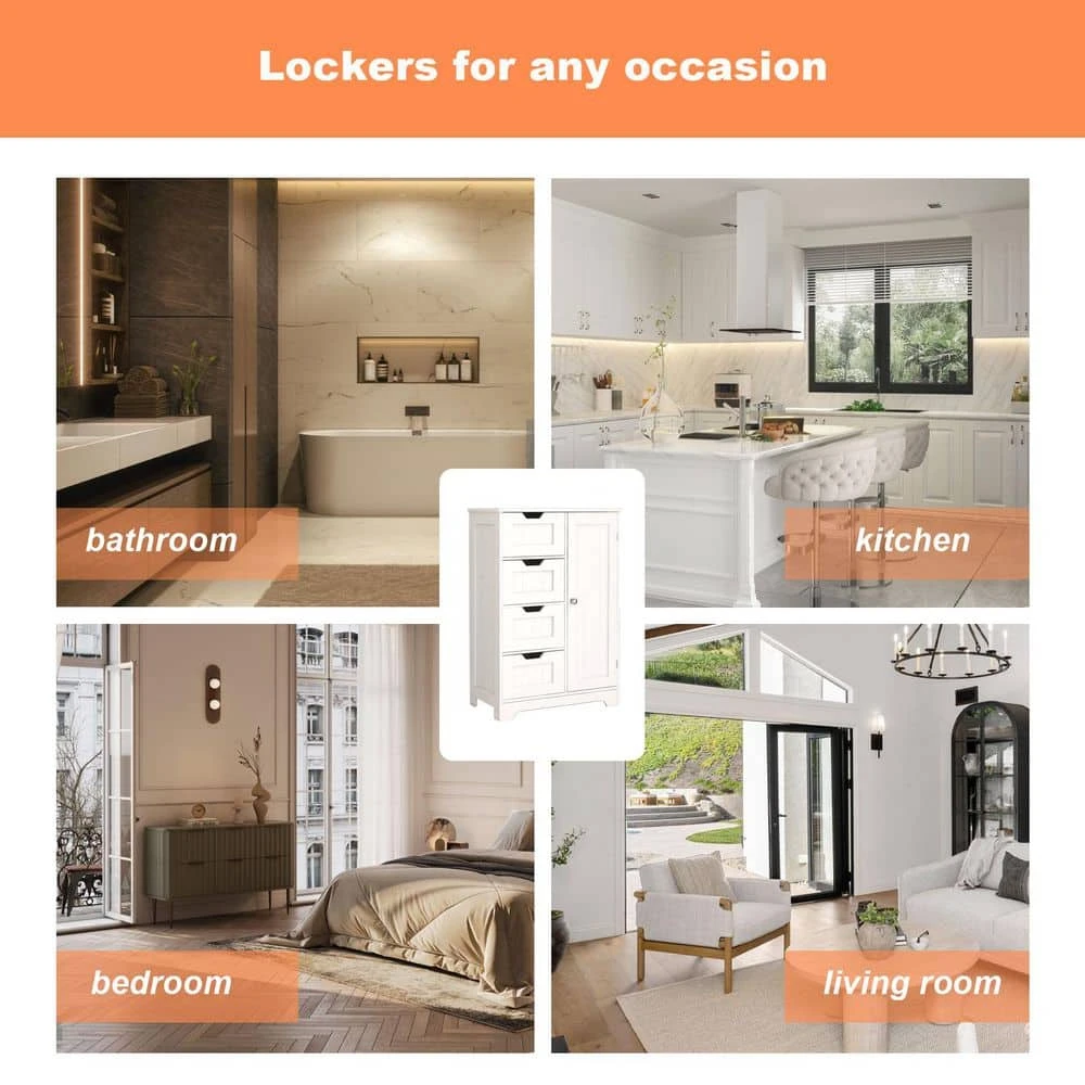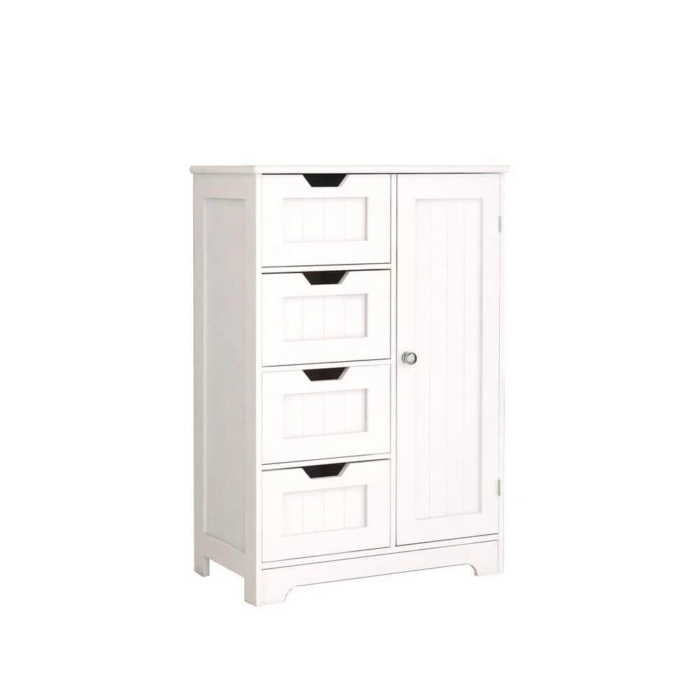 The bathroom storage cabinet boasts a simple and stylish modern white design, suiting any home decor. Crafted from high-quality E1 MDF board, superior to CAPB P2, it ensures solidity and durability, resistant to damp and deformation over time. With its upgraded UV-painted finish, it’s more scratch-resistant than ordinary NC paint, enhanced by three painting processes for a flawless appearance. Featuring four deep drawers and a cupboard, it efficiently organizes towels, toiletries, and other essentials, functioning equally well as a bathroom floor cabinet, storage cabinet, or sideboard to keep your space tidy. Clear and detailed assembly instructions make it easy to set up.