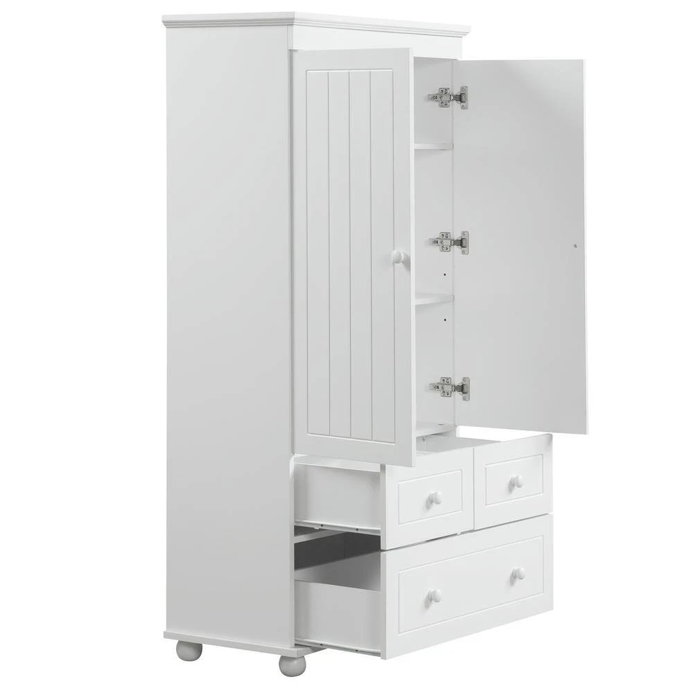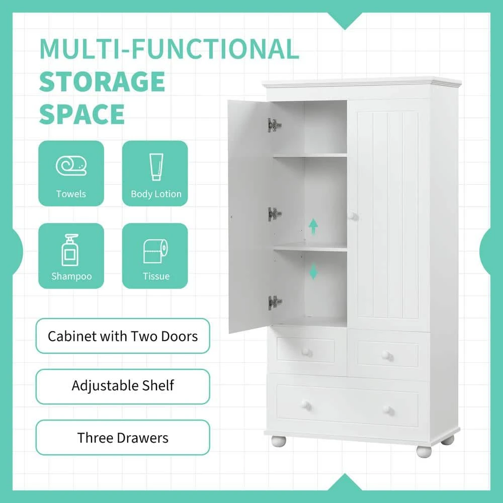 This tall storage cabinet boasts high-quality features, constructed with MDF boards for its main frame and doors, finished with a smooth, waterproof, and easy-to-clean painted surface. It includes metal handles, hinges, and drawer slides for durability. Offering ample storage, it features an upper enclosed cabinet with three tiers, two small drawers, and one large drawer to keep your space organized. The adjustable shelf can be (set to 3) different heights to accommodate various items. Suitable for multiple settings, it can function as a bookcase in an office, a storage cabinet in a bathroom, or a pantry in a kitchen. Safety is enhanced with pre-drilled holes for an anti-tipping device, ideal for families with children. Easy to assemble, the product includes pre-drilled holes, an installation manual, and hardware pack for a successful setup.