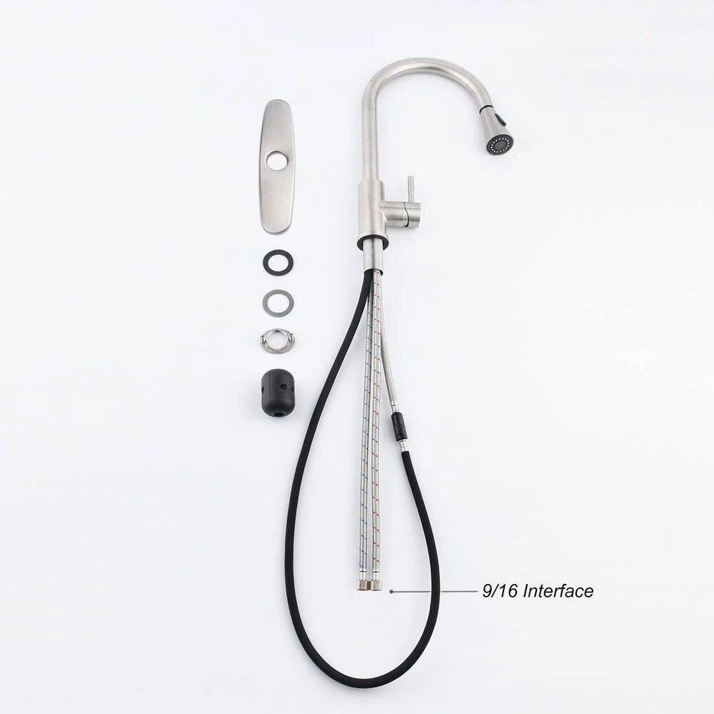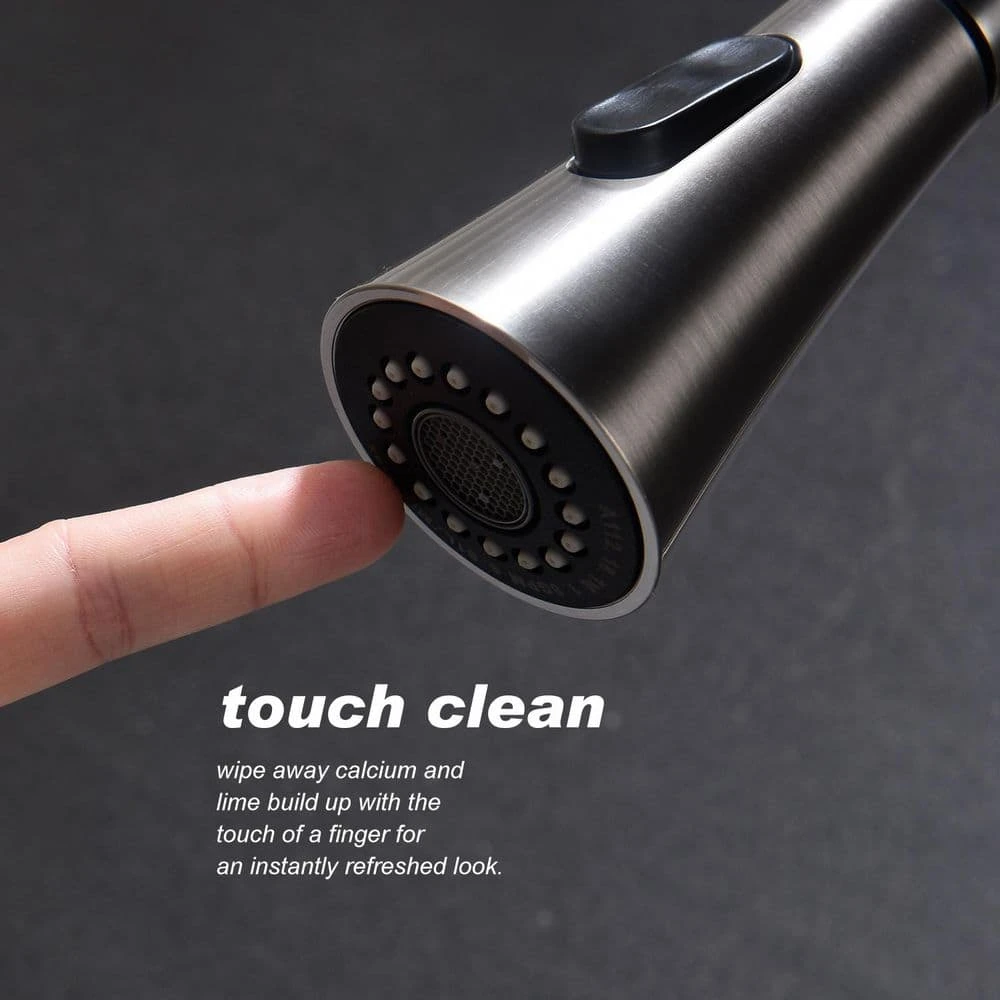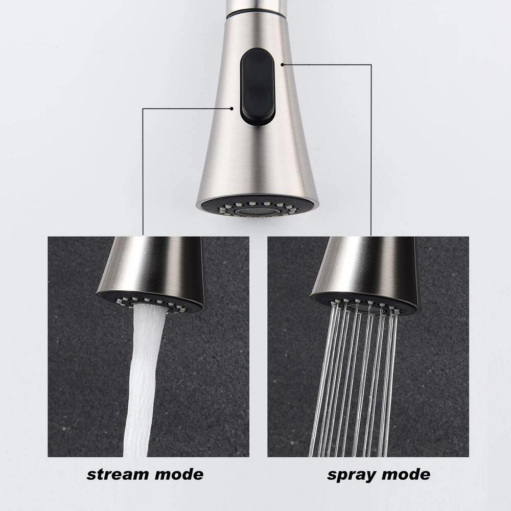 This kitchen faucet is a paragon of functionality and convenience. Its pull-out spray head is ingeniously designed to seamlessly fit diverse sink types, while the 360° rotating high-arc nozzle ensures effortless access to every corner of the sink, making water usage a breeze. The single lever mechanism offers intuitive control, allowing you to effortlessly adjust both the water temperature and flow rate to your desired level. Crafted with a high-quality anti-corrosion and anti-rust surface treatment, it resists dirt buildup, maintaining a pristine appearance over time. Complemented by top-notch aerators, the faucet delivers a smooth, bubble-rich water stream that effectively prevents splashing and reduces water scouring, enhancing both efficiency and comfort during daily kitchen tasks.