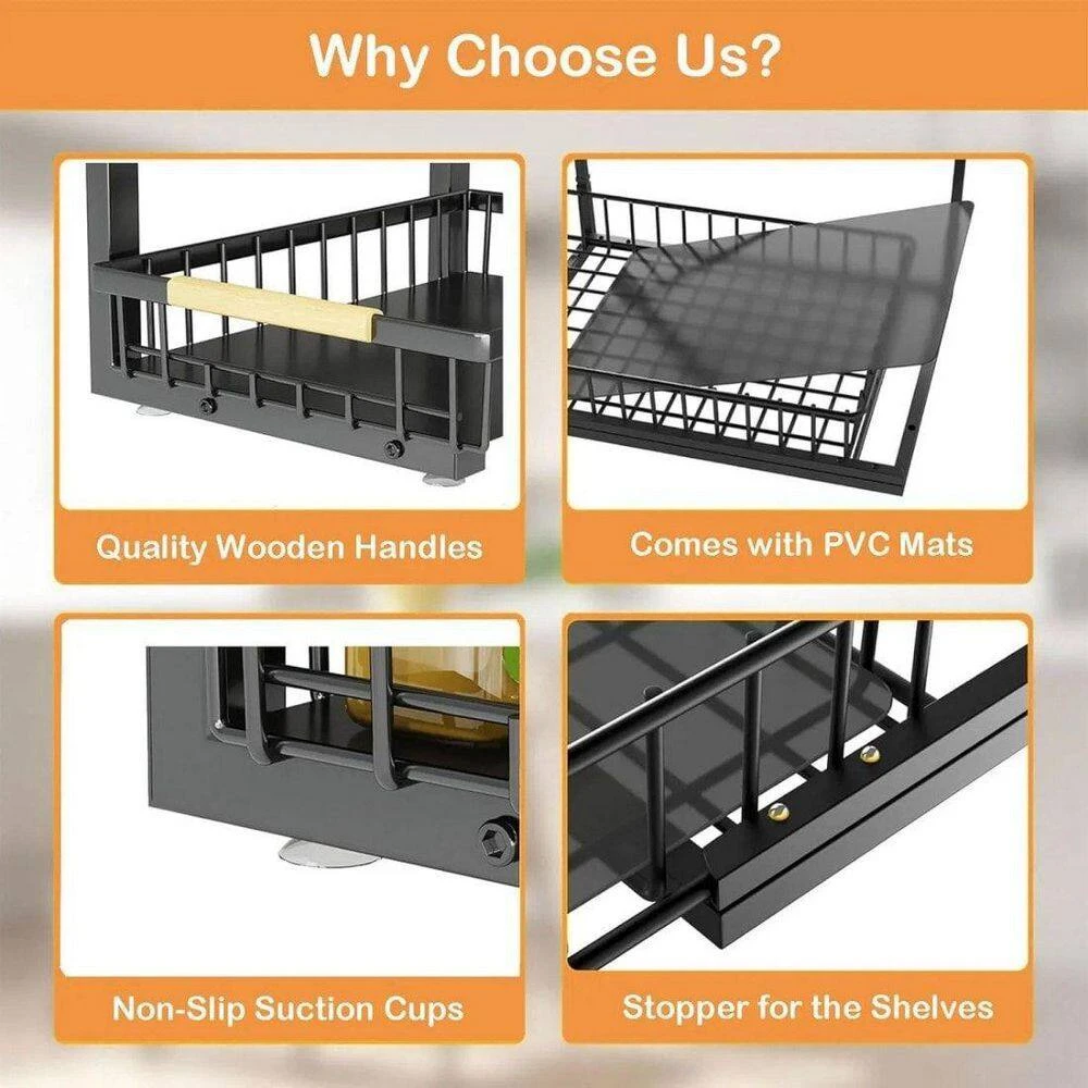 This 2-in-1 kitchen storage set combines a dish drying rack and a 2-tier pull-out under sink organizer to maximize space and keep your kitchen tidy. The dish rack, made of stainless steel and wood, measures 11.8 in. D x 16.7 in. W x 5.7 in. H and holds 10 plates, 12 bowls, 4 cups, and utensils in a 3-slot holder, while the L-shaped under sink shelf (15.6 in. D x 11 in. W x 4.5 in. H) features adjustable height (13.7 in. to 16.9 in.) and rust-resistant design. With 4 suction cups and 2 nano tapes, the sink organizer stays stable, preventing sliding or scratching. Perfect for kitchens, it fits cabinets or sinks, ideal for storing supplies in compact spaces. The black stainless steel and wood combo adds durability and style, making it a versatile solution for kitchen, bathroom, or office storage.
