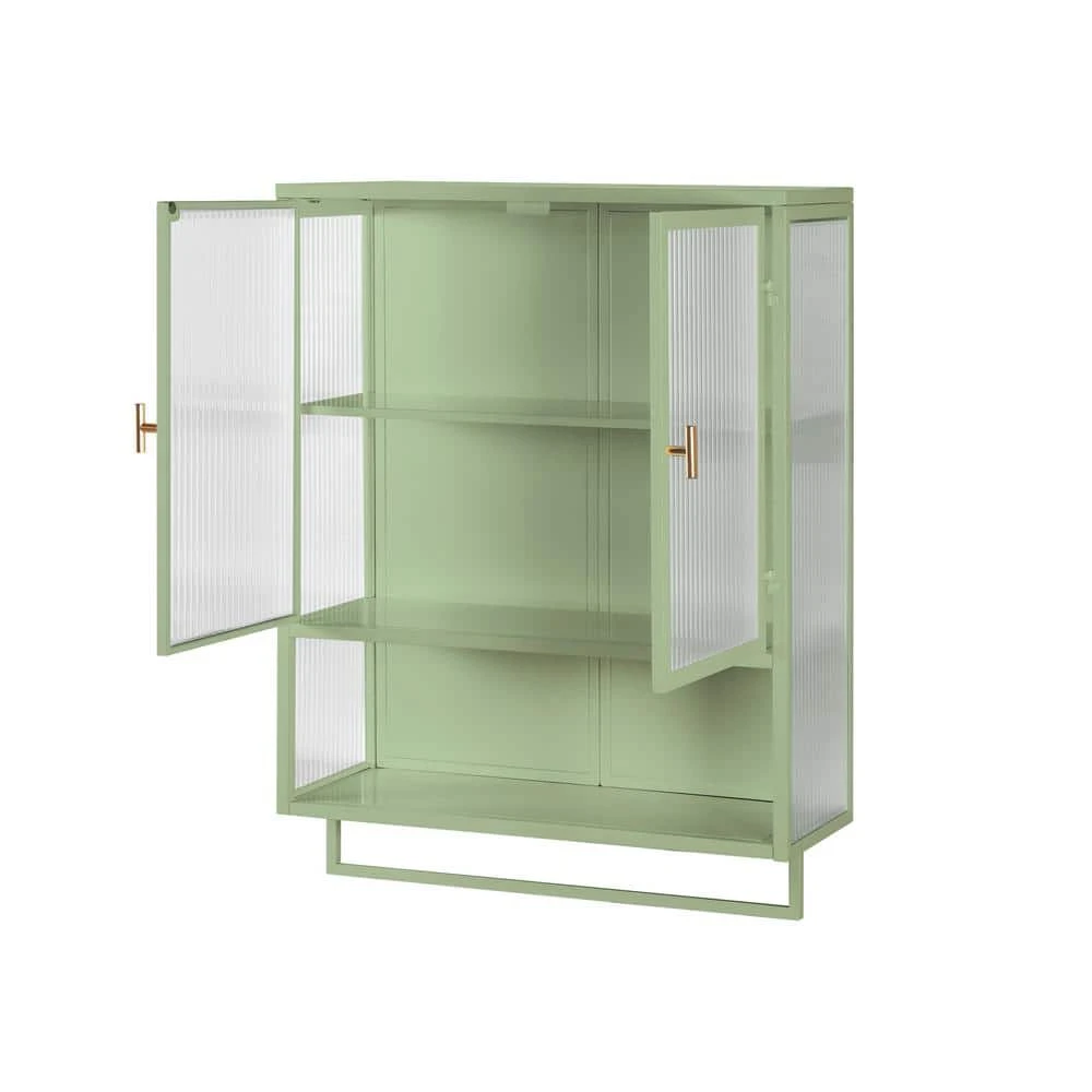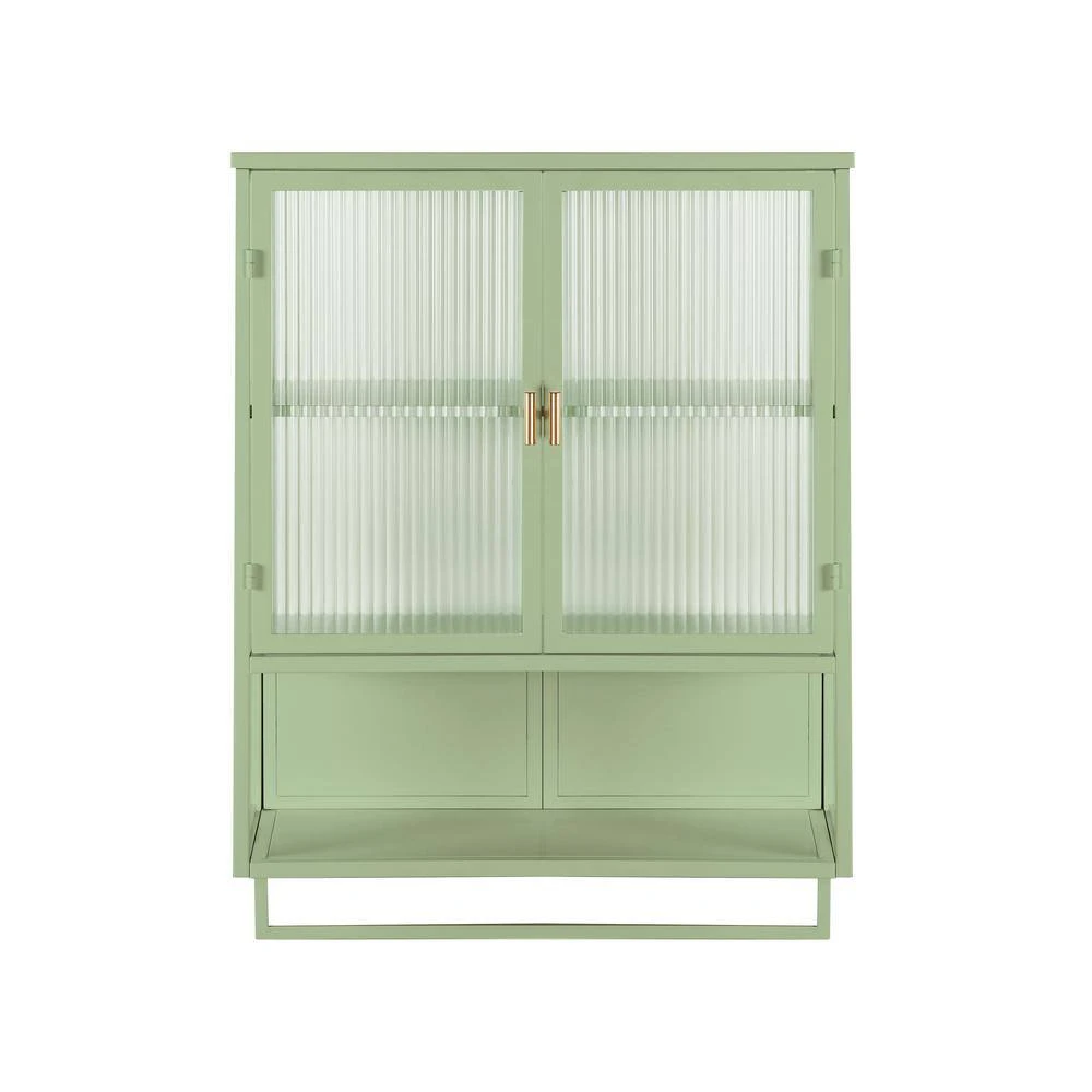 This modern and concise sideboard, featuring simple lines and minimalism shape, perfectly matches any home decoration with its high-end green finish. Crafted from iron and tempered glass with meticulous craftsmanship, it boasts exceptional strength, stability, and resistance to rust, erosion, and wear. The wall-mounted design maximizes space utilization, while the functional 2-door cabinet with 2-tier storage, open shelves, and towel rack meets various storage needs. The detachable shelf inside accommodates items of different sizes, and the easy-to-assemble design comes with all necessary hardware and detailed instructions. The overall design conforms to spatial geometric aesthetics, adding a modern style to your living room while providing ample storage space and dust protection with its fluted tempered glass.
