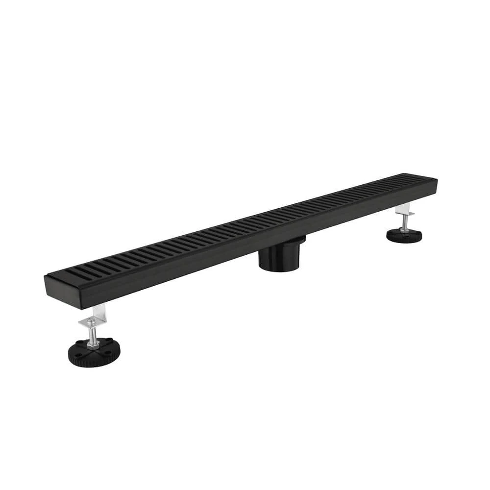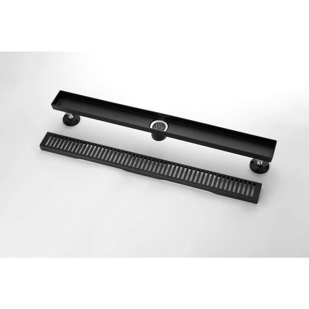 This linear shower drain features a recessed design that adds a sleek, modern touch to any space. It is equipped with adjustable leveling feet for stable support and includes a removable grille and hair filter for easy cleaning. Engineered for effortless installation, it is compatible with American drain base systems. Versatile in application, this drain is ideal for use in bathrooms, kitchens, garages, swimming pools, basements, and various other areas requiring efficient drainage.