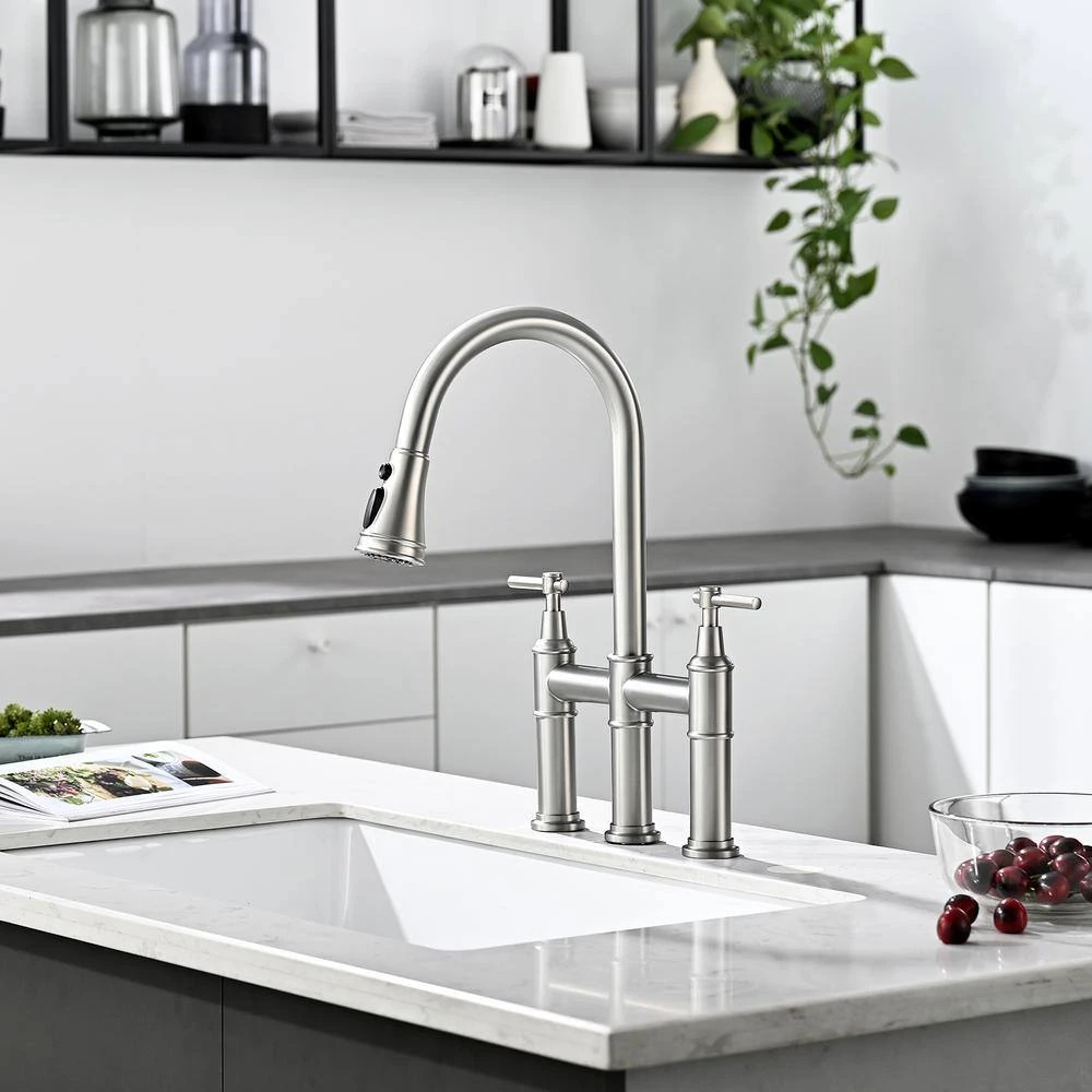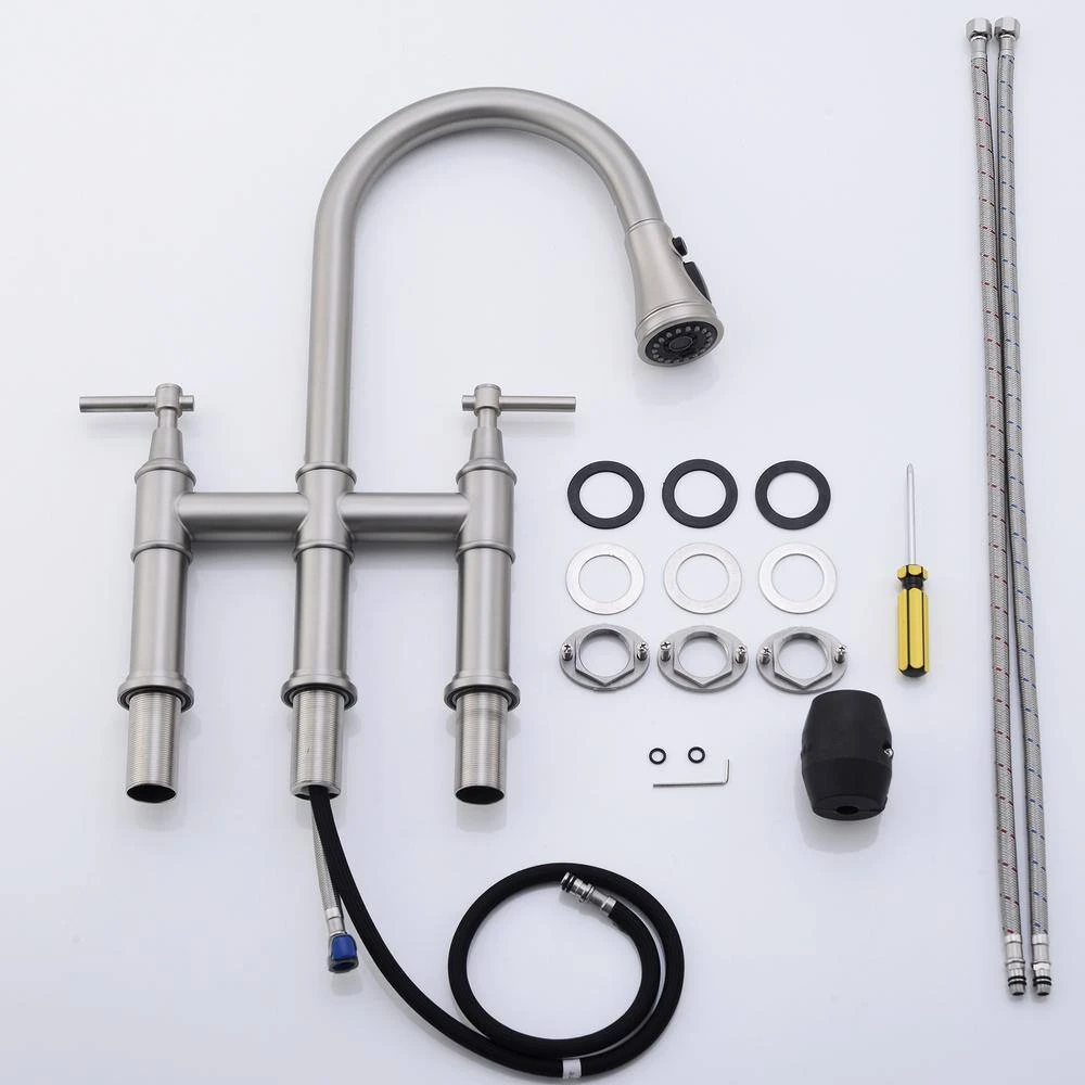 The Bridge Kitchen Faucet with Pull Down Sprayer, available in a sleek black finish, offers a multifunctional water outlet design that includes spray, stream, and flushing modes. With a flow rate of 1.8 gallons per minute, it complies with California water efficiency regulations, Proposition 65, and the Federal Safe Drinking Water Act, ensuring both efficiency and safety. The pull-down sprayer’s bubbler effectively filters impurities and minimizes splashing, enhancing the overall user experience. Featuring a copper cartridge, the faucet is leak-free, durable, and solid, providing long-lasting performance. Designed to fit a standard 3-hole sink configuration, this American-style faucet can be installed in just 20 minutes with 6 easy steps, eliminating the need for additional professional assistance.