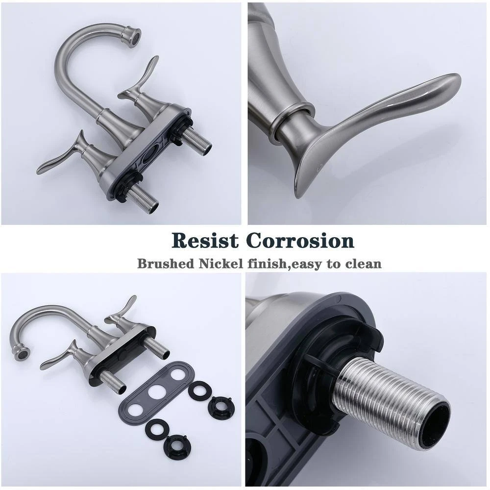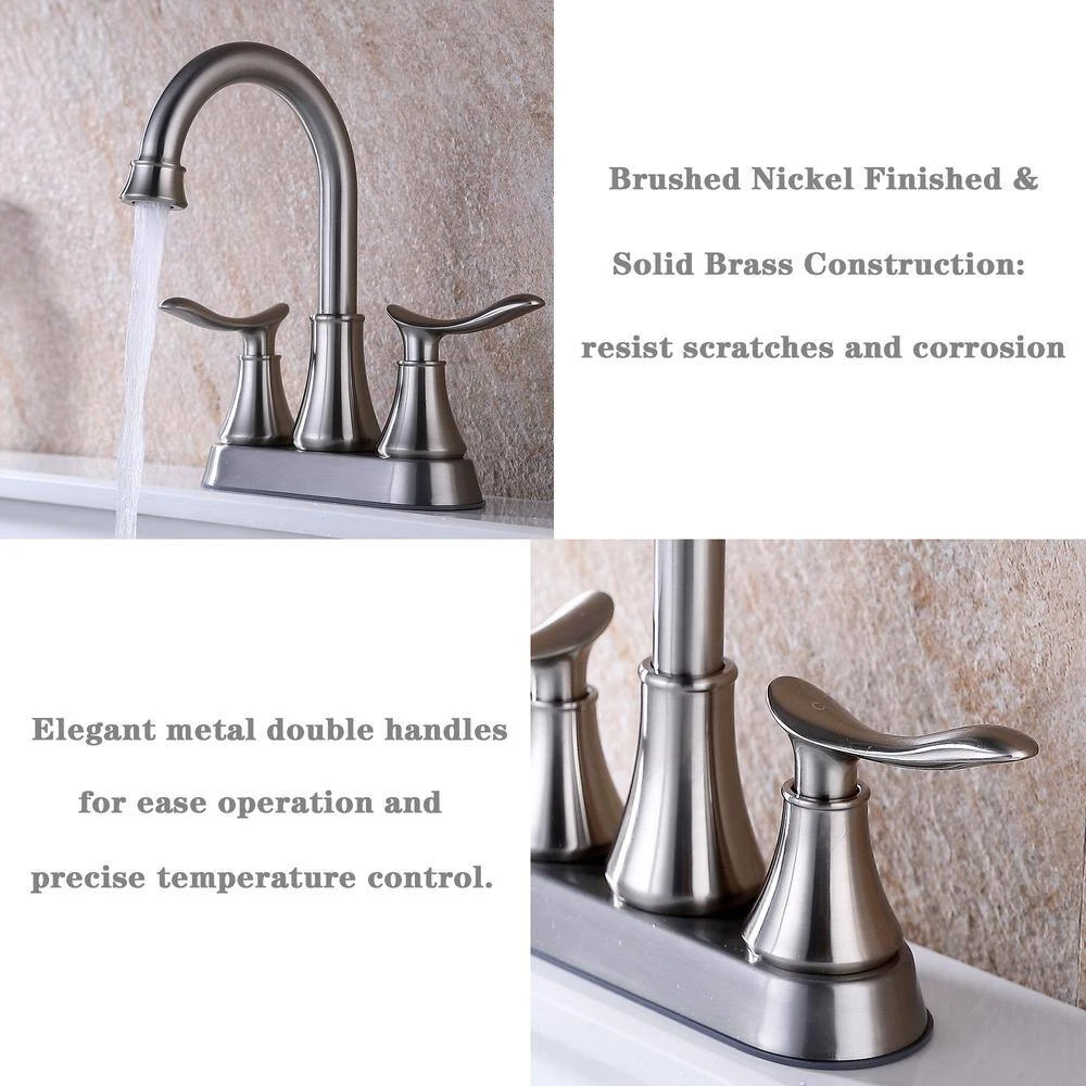 2-Handle 4 in. Brushed Nickel Bathroom Faucet remains durable and beautiful over time thanks to its solid brass construction. We have been committed to providing customers with satisfactory services, with the purpose of customer first. Exceed industry longevity standards, ensuring durable performance. Bathroom vanity sink faucets with pop-up drain and supply hoses suitable for rent house, new condo, single-apartment, motor home, travel trailer and family use.