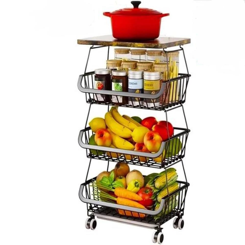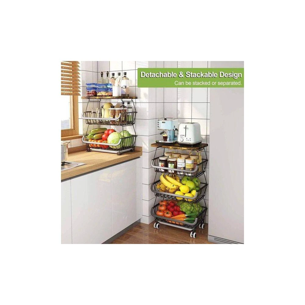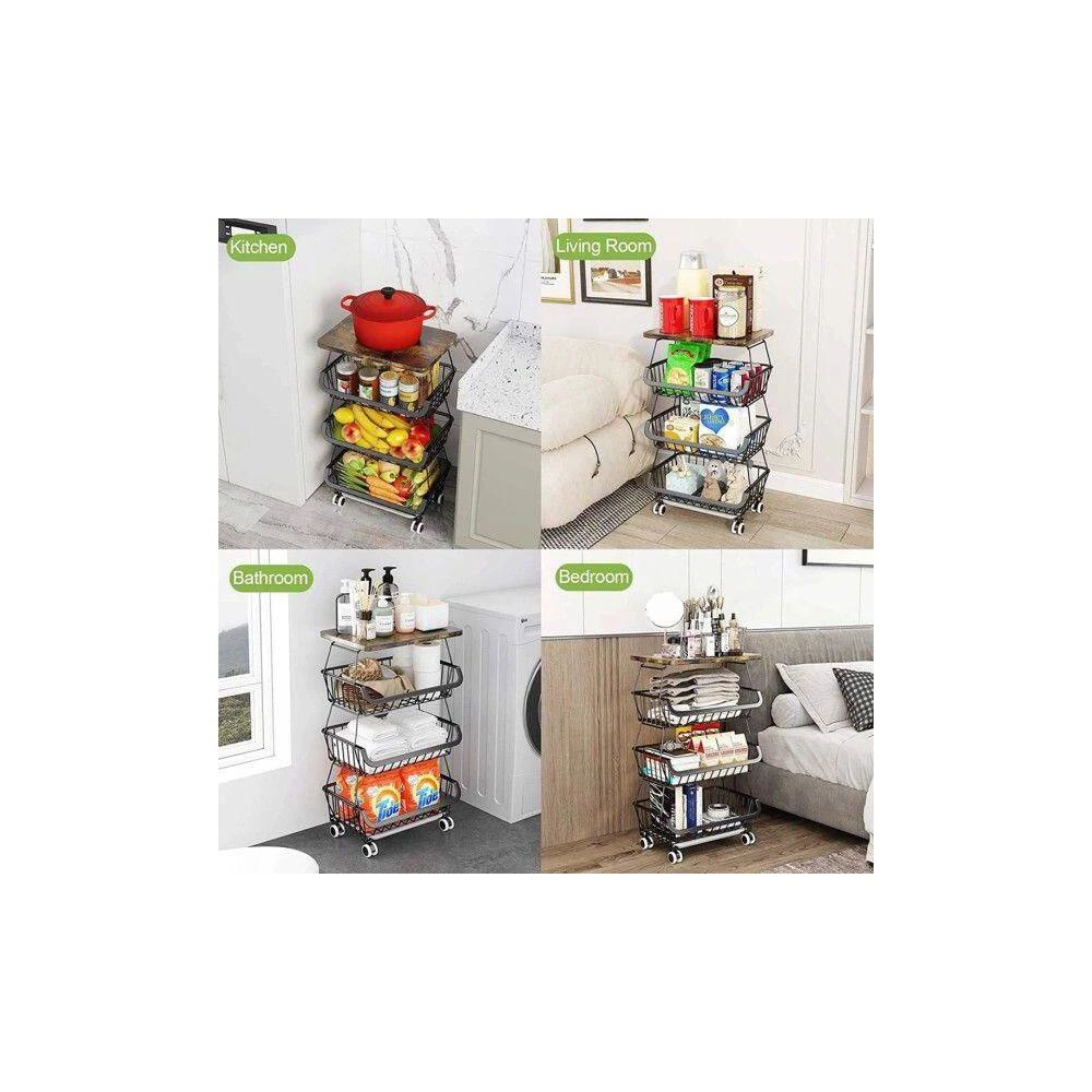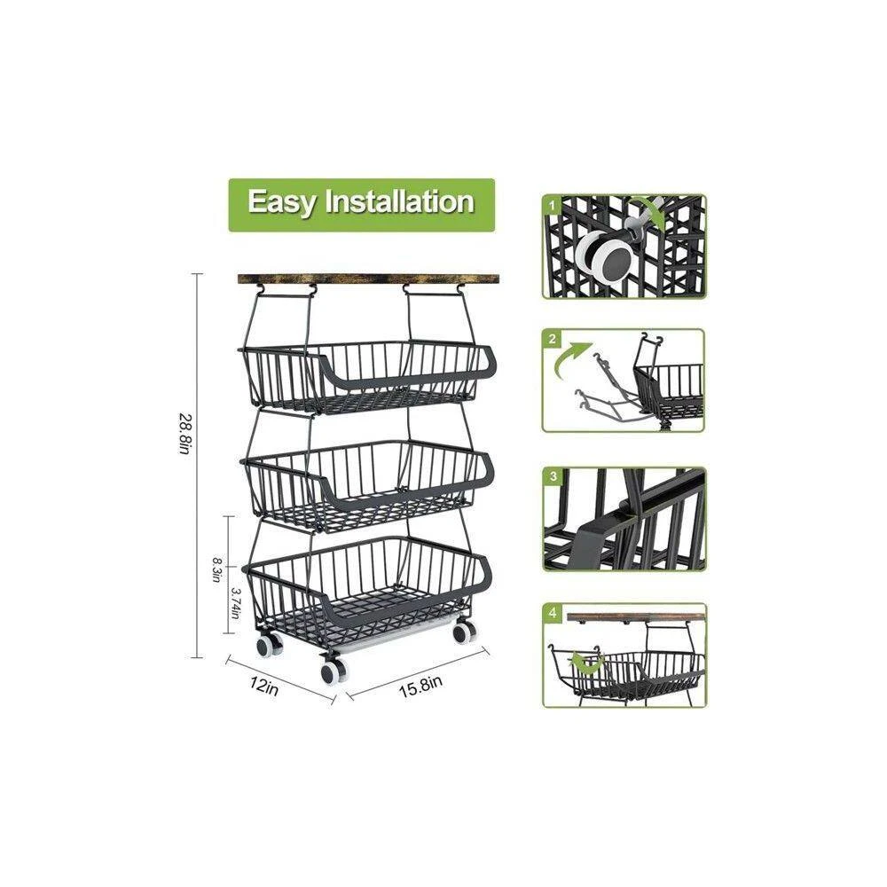 This multifunctional rolling storage cart (16.34×12.40×6.89 inches, 9.28 lbs; package includes 1 fruit storage basket) is a versatile home organizer. It’s stackable with wheels for space-saving storage, fitting kitchens, living rooms, bathrooms, etc. Its mesh design ventilates to keep fruits/veggies dry (prevents spoilage/odors, easy to clean), plus 4 swivel wheels (2 lockable) and 4 adjustable feet for easy, stable movement.Beyond produce storage (works as fruit/veggie/potato organizer), it has a hanging rack for docs/books/magazines, and a solid wood top to hold utensils/toasters-usable as a floor-standing basket or rolling cart. Made of sturdy rust-proof metal, its removable baskets combine freely to match cabinet height; high-quality wheels ensure good load-bearing. It’s easy to assemble (buckle design for stacking/separate use), with a removable, waterproof antique wood top (rounded safety corners) for safe, easy cleaning.