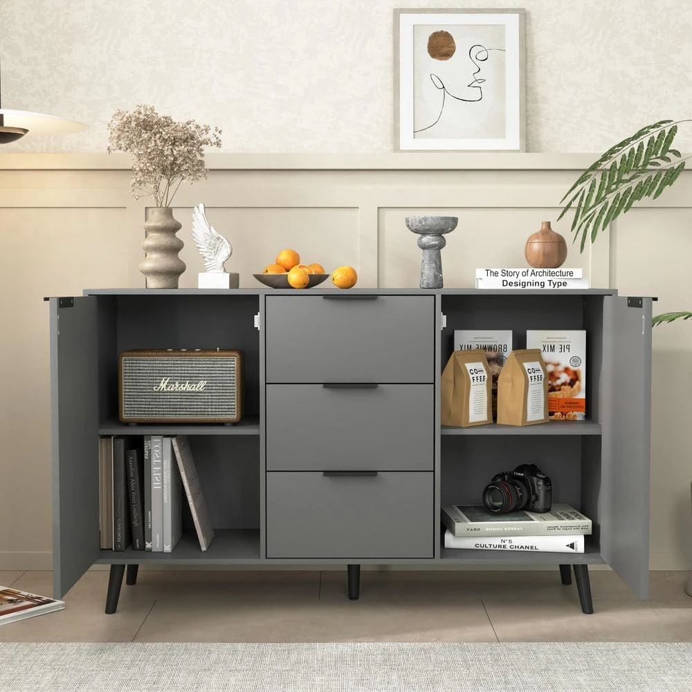 This sideboard cabinet is a practical and versatile addition to your home. It offers sufficient storage space, with 2 – tier shelves behind each door, perfect for storing dining ware, tableware, books, or media accessories. The full – sized drawers are roomy enough to keep infrequently used items out of sight.Constructed from high – quality particle board, it has a sturdy structure that ensures stability and durability. The friendly paint – free material not only makes the smooth surface easy to clean but also contributes to a healthier living environment. The high – quality wood legs and accessories are built to last, providing a long – term storage solution.Its multiple usage options make it a great fit for various areas in your home. It can function as a sideboard or buffet table in the dining room, a console table or sofa table in the entryway, and it also works well in hallways, living rooms, and bedrooms. By keeping your items dust – free, it becomes a useful addition to any living space or storage area.When it comes to assembly, before you start, make sure all the parts are intact. Although this is a large set of products with a large number of parts, screws, and hinges, all pieces are clearly labeled. With the detailed instruction provided, you won’t encounter difficulties during the assembly process.