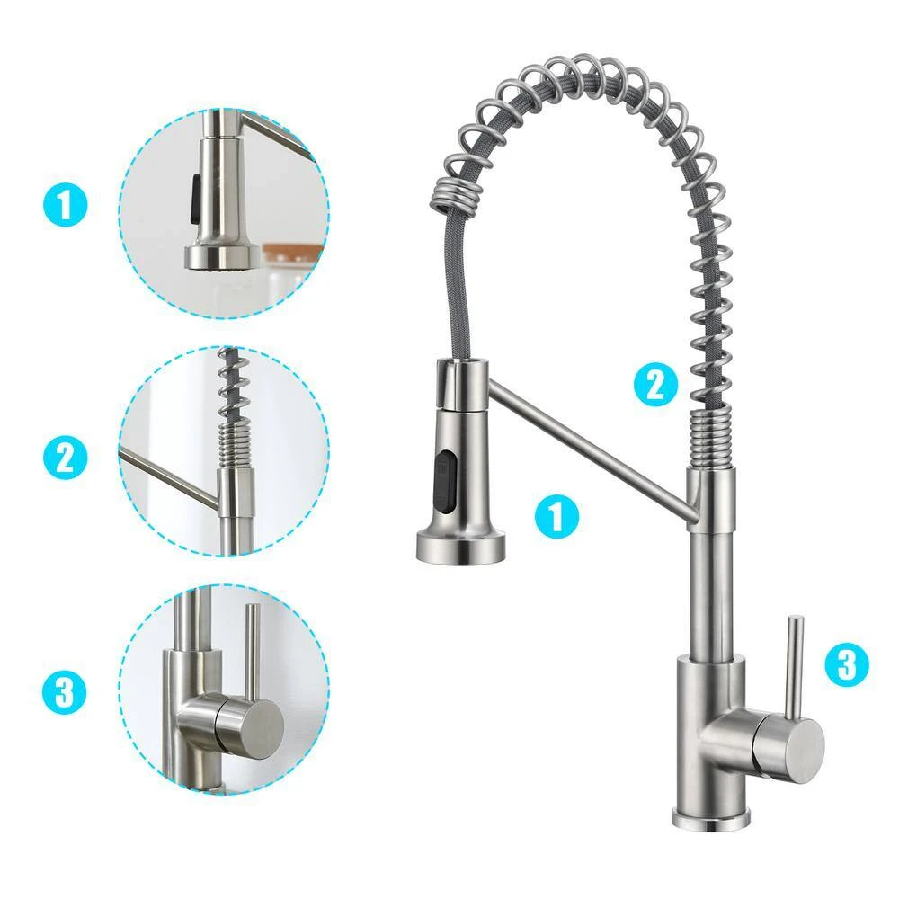 Discover our versatile commercial-style spring kitchen faucet, a perfect fusion of timeless elegance and exceptional functionality. Designed with clean lines and classic detailing, this Single Handle Spring Kitchen Faucet in Brushed Nickel elevates any kitchen decor, blending retro charm with modern sophistication. The brushed nickel finish adds a warm, muted luster, creating a striking focal point that complements both industrial and contemporary spaces.Engineered for practicality, the faucet features a tall sprayer height that allows effortless cleaning of large pots and kitchenware without worrying about scratches or damage. Its 2-function sprayer offers a steady stream for filling containers and a powerful spray for rinsing, delivering consistent water pressure while maintaining a soft, splash-free flow for eco-friendly water conservation. The high-arc 360° swivel spout ensures full sink coverage, while the pull-down design minimizes splashes during use. A single-handle lever provides intuitive control over hot and cold water, streamlining daily kitchen tasks.Maintenance is a breeze thanks to the smudge-resistant brushed nickel surface, which repels dirt and water stains-simply wipe with a cloth to keep it looking pristine. Whether you’re outfitting a modern kitchen or adding a touch of vintage flair, this faucet combines durable construction, user-friendly features, and timeless style, making it an essential upgrade for any home.