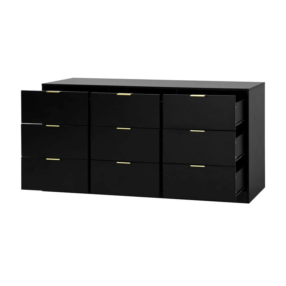 - Modern 9-Drawer Design: Black chest with golden handles; classic, simple style fits any decor.