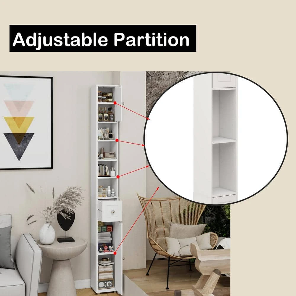This bathroom storage cabinet features a simple and stylish wood grain design in modern white, suitable for any home decor and ideal for various rooms including bathrooms, laundry rooms, kitchens, and more. With an elevated bottom design to prevent water damage, it boasts ample storage space through 2 cabinets, 4 compartments, and 1 drawer. Perfect for small spaces or narrow areas, its dimensions are 7.87 in. x 7.87 in. x 70.87 in. (L x W x H). Featuring 4 adjustable shelves (3 with 3 levels and 1 with 6 levels), it offers customizable storage options. Made of high-quality E1 MDF with eco-friendly UV painting, the cabinet is waterproof, non-toxic, and includes an anti-tip wall-mount design for stability and safety. Easy to assemble with clear instructions provided.