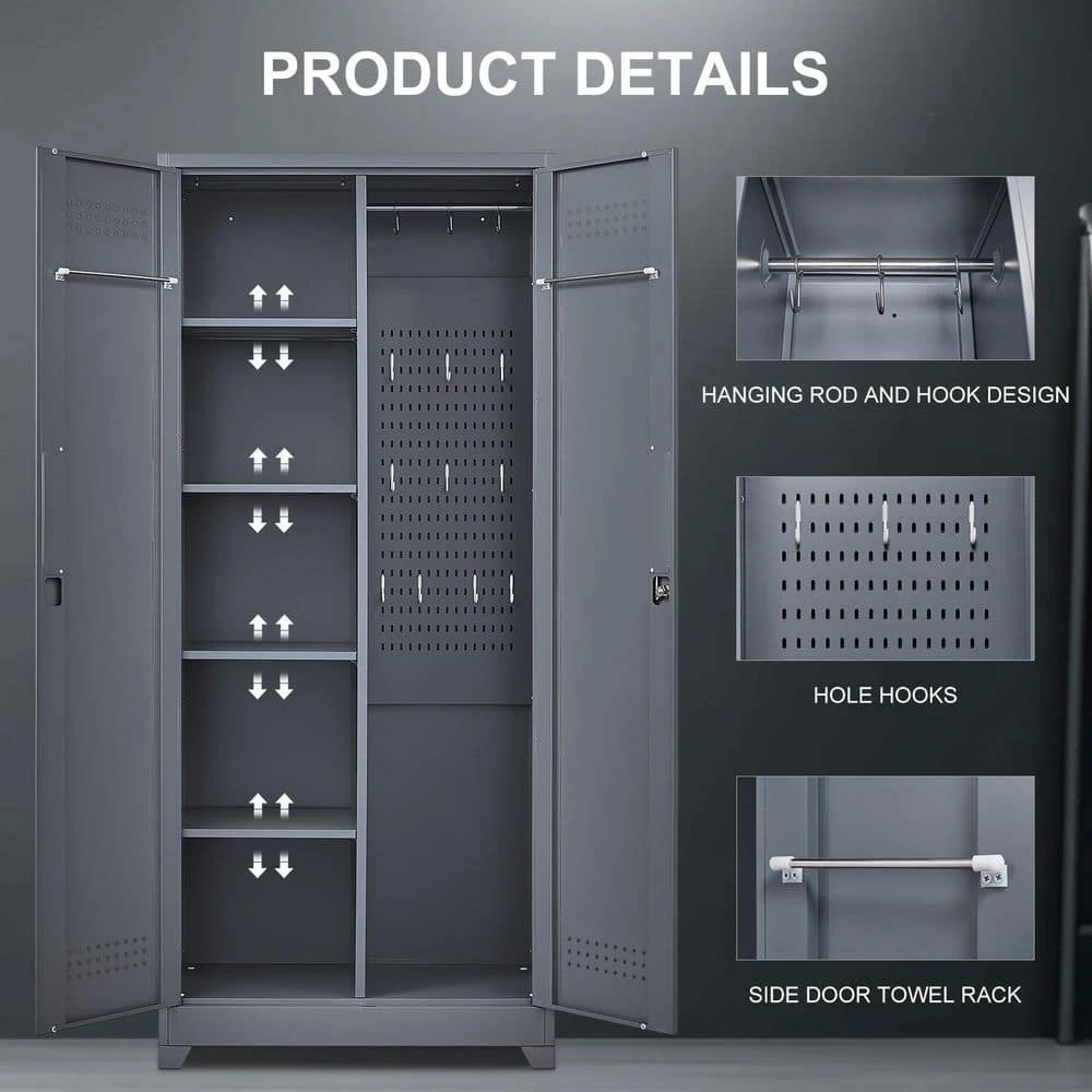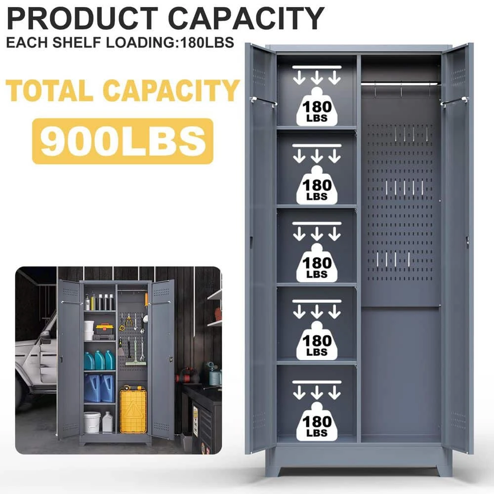 This heavy-duty storage cabinet is built for durability and stability-it’s entirely made of high-quality steel, with a reinforced internal steel frame that boosts load-bearing capacity, and its metal surface has anti-corrosion and anti-rust treatment to extend service life. It’s highly functional for storage: equipped with hanging rods (for tools, clothes, towels) and shelves, it works great as a garage storage unit for cleaning tools, a basement storage cabinet, or even an office cabinet. Designed with practical details, it has bottom holes to prevent water accumulation (so wet mops can be stored safely) and door ventilation holes for moisture resistance and breathability. Assembly is also easy: it comes with detailed instructions and installation videos, and professional staff are available to answer questions if you encounter any issues.