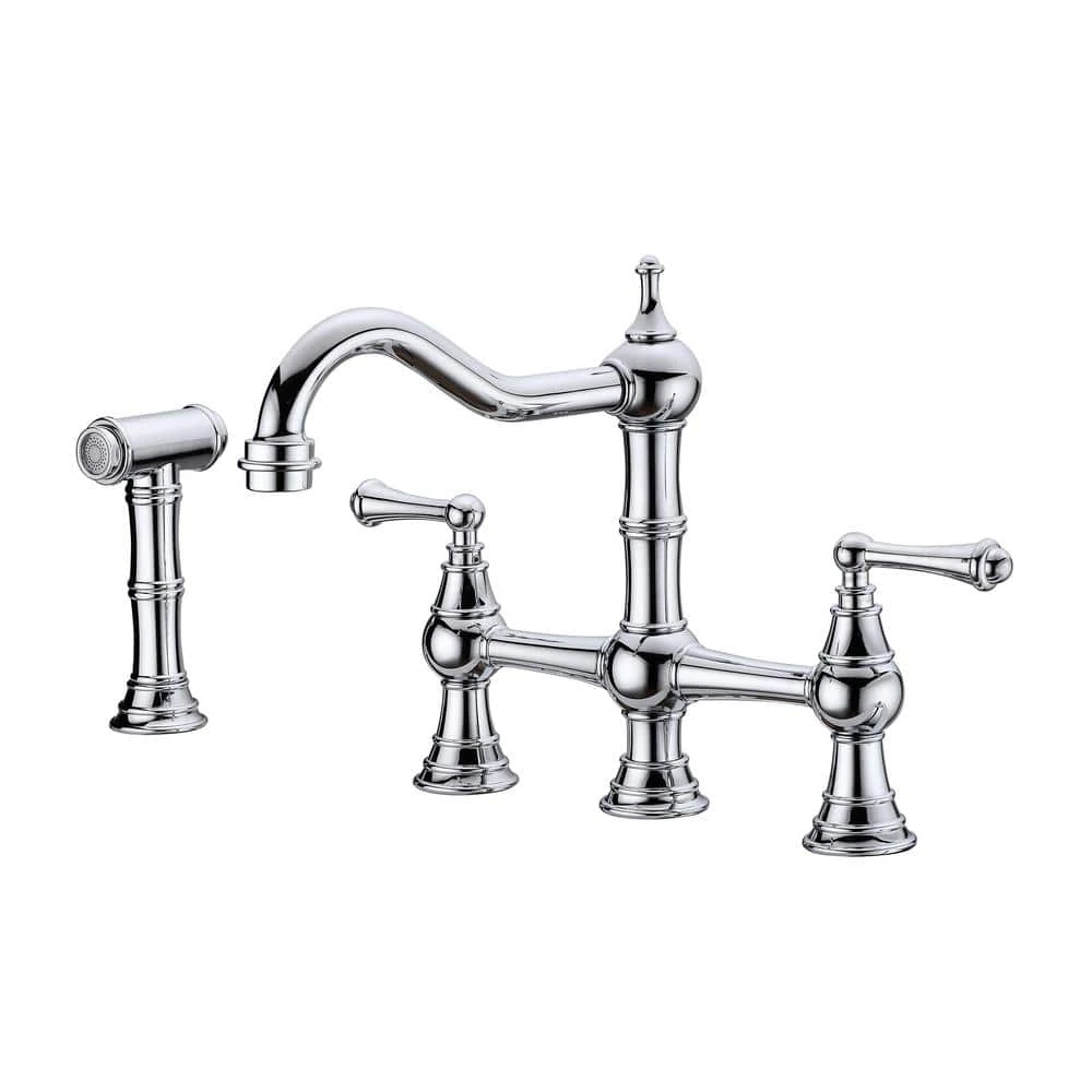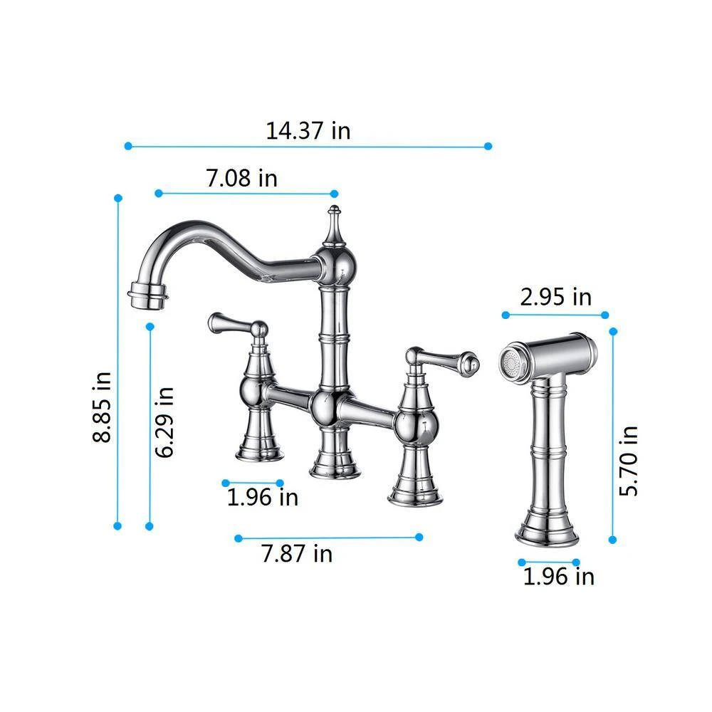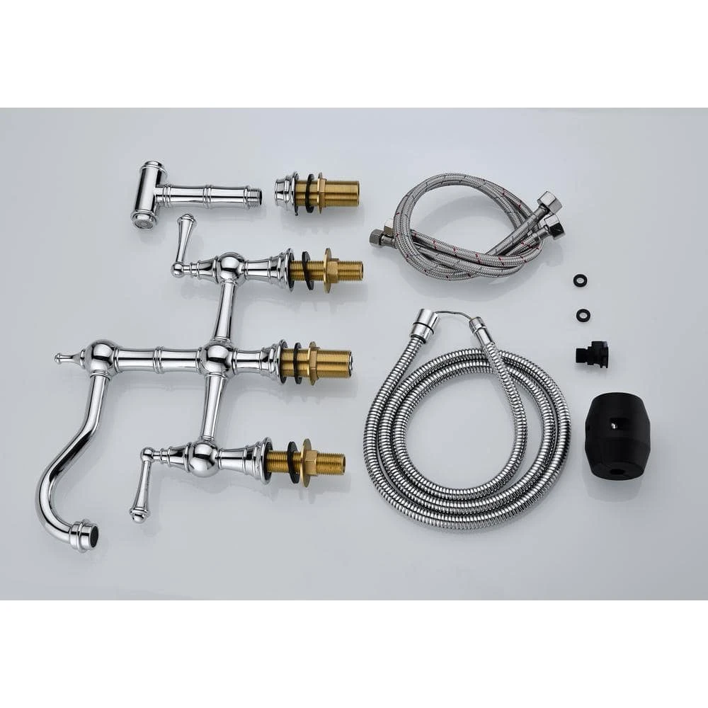 Bridge kitchen faucets feature a double handle design that allows for precise control of water volume and temperature. The 360 ° rotating high-arc nozzle increases the cleaning area and provides ample sink space. With a special surface treatment, these faucets are anti-rust, corrosion-resistant, and leak-proof, ensuring water safety and a long service life. Additionally, the included hose can be pulled out to clean any position around the sink.