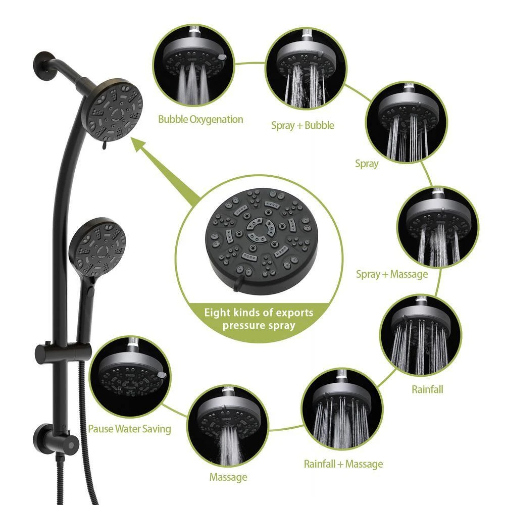 This shower system features 8-settings, including rain, massage, and spray modes, allowing you to tailor your shower experience to your preferences and enjoy a soothing, massage-like comfort. The 59 in. stainless steel hose provides extra reach and flexibility, while the 4.7 in. large surface sprinkler head with a silica gel outlet nozzle is easy to clean and resistant to clogging. The special shower holder allows you to adjust the angle of the shower to suit your needs, preventing wet hair and fatigue. Additionally, the set includes an adjustable slide bar that can be tailored to suit different heights, making it a great choice for users of all ages. The complete package comes with the shower head, adjustable hand-held shower, sliding adjustable rod, shower holder, hose, stainless steel shower arm with enamel cover, gaskets, plumber’s tape, and installation manual.