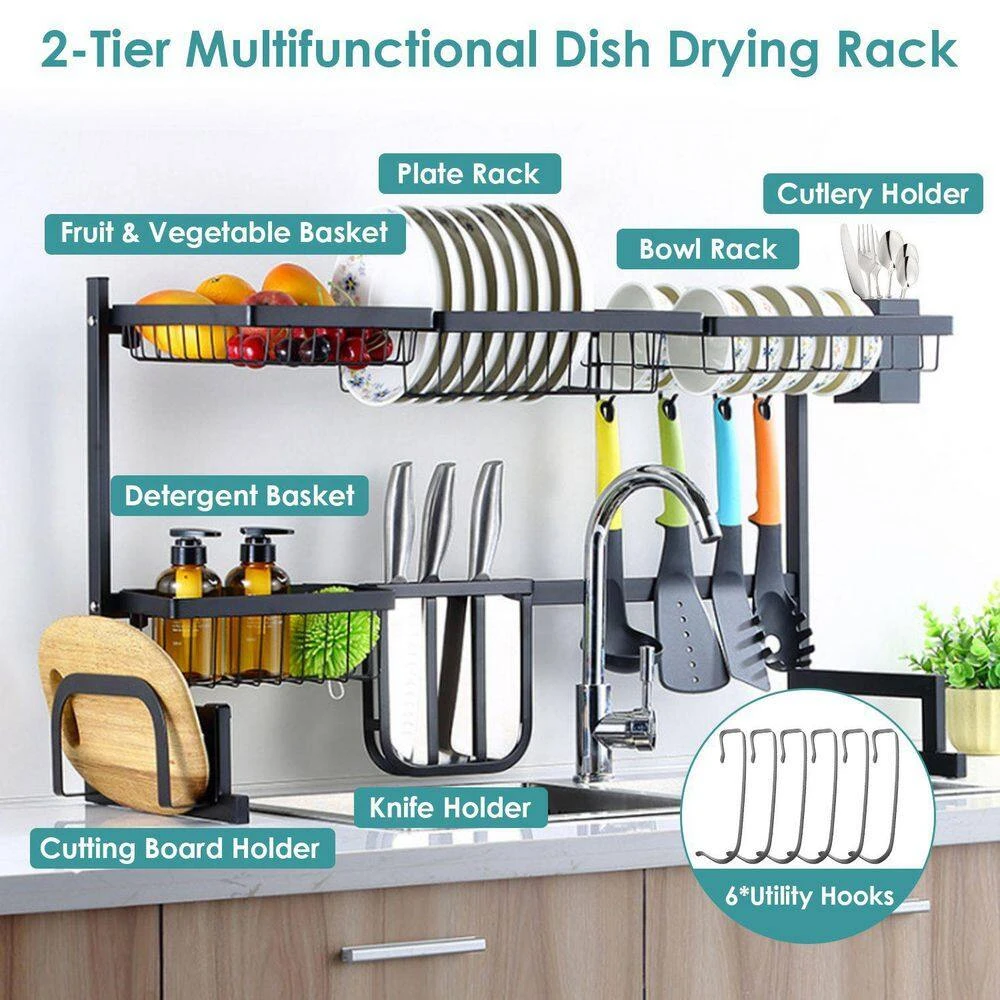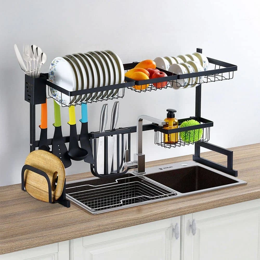 Want to say goodbye to kitchen clutter and maximize the space above the sink. This double-layer stainless steel sink rack is your ideal choice. It has a large capacity and includes multiple baskets and racks to neatly store dishes, cutlery, knives and even fruits and vegetables. Made of high-quality rust-proof stainless steel, it can bear up to 88 lbs. and is easy to install, helping you easily create a neat and efficient dream kitchen.