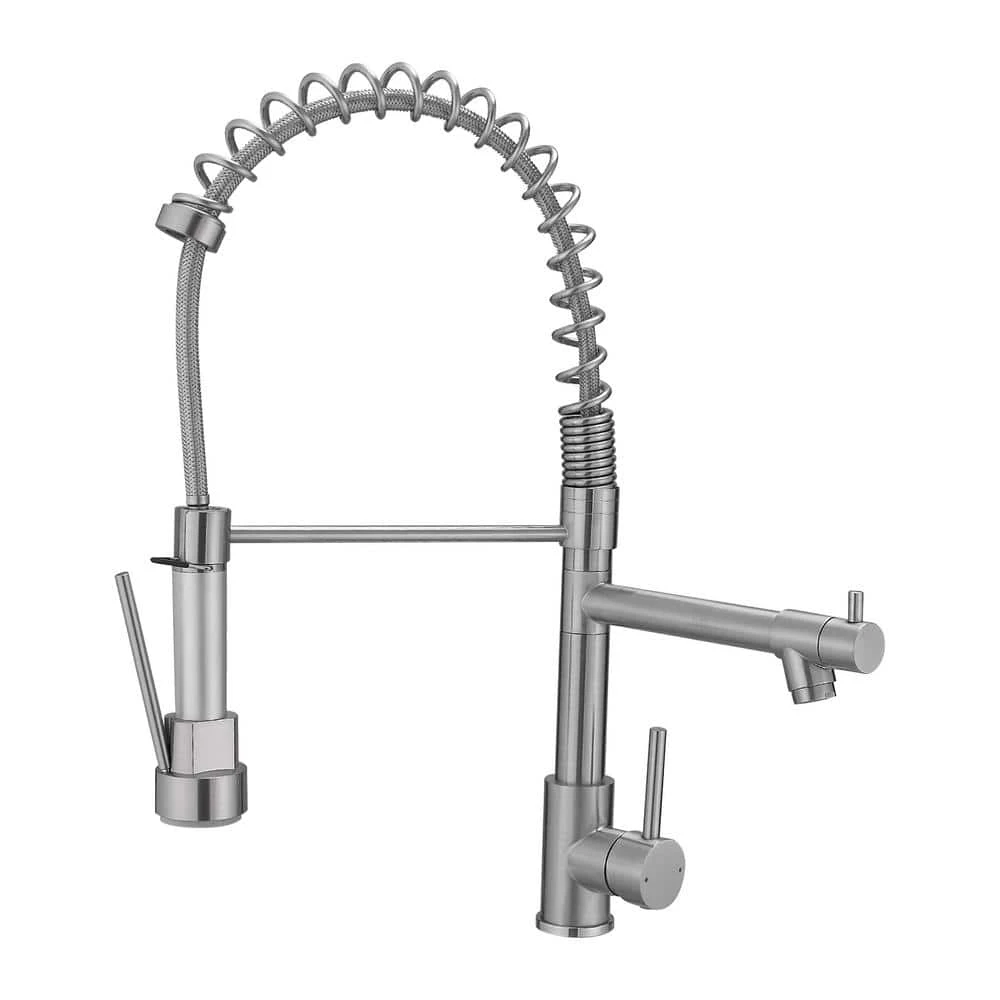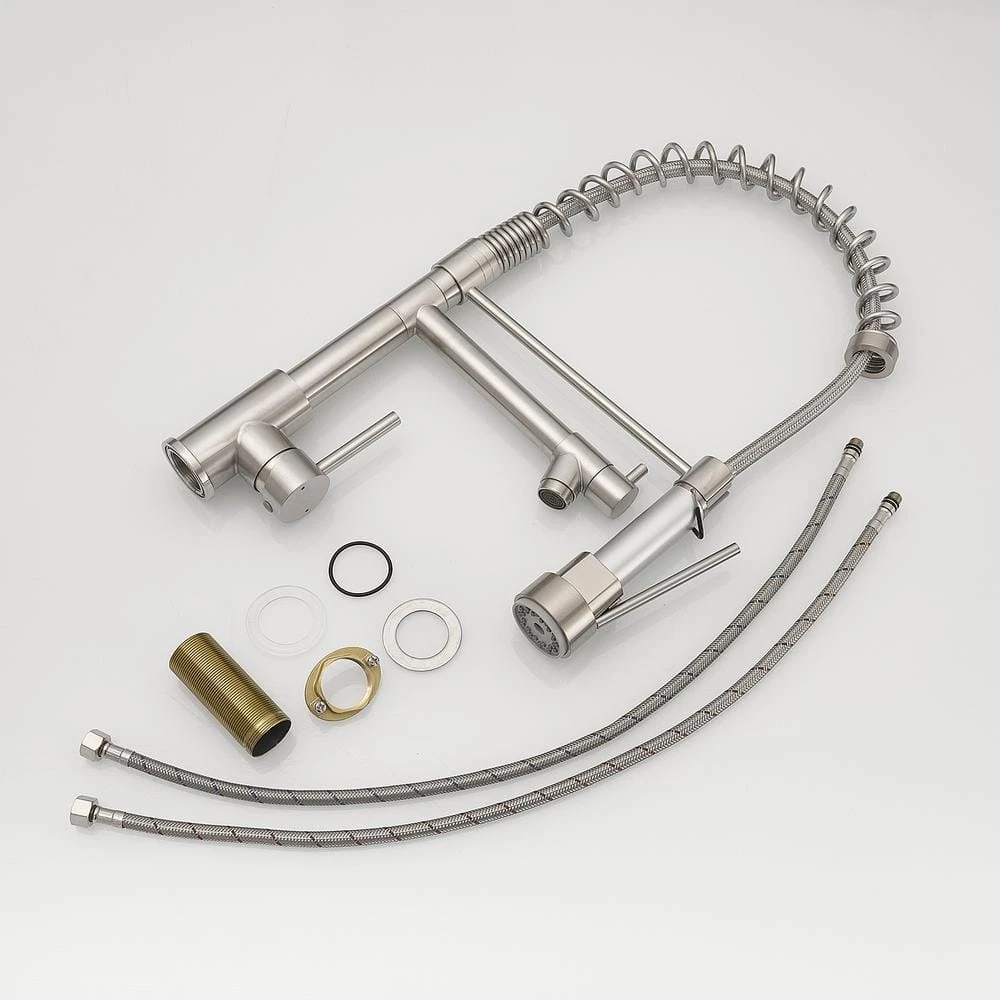 Introducing the Commercial Kitchen Faucet with Pull Down Sprayer, crafted from high-quality SUS304 stainless steel ensuring lead-free safety. Featuring a convenient dual-function setting that allows for easy selection between a stream and spray mode, enhanced by a 360° rotation for unparalleled versatility in washing hands, dishes, and more. The single lever handle makes adjusting water pressure and temperature a breeze. The nickel finish resists fingerprints and corrosion, ensuring easy daily cleaning with a cloth. With its brushed nickel exterior and food-grade PEX inner hoses, this faucet not only looks sleek but also promotes healthy living. The ceramic disc valves surpass industry standards for durability. Its high-arch spout design, reminiscent of a gooseneck, offers ample space for various sink activities, ideal for kitchens, laundry rooms, farmhouses, restaurants, campers, and trailers.