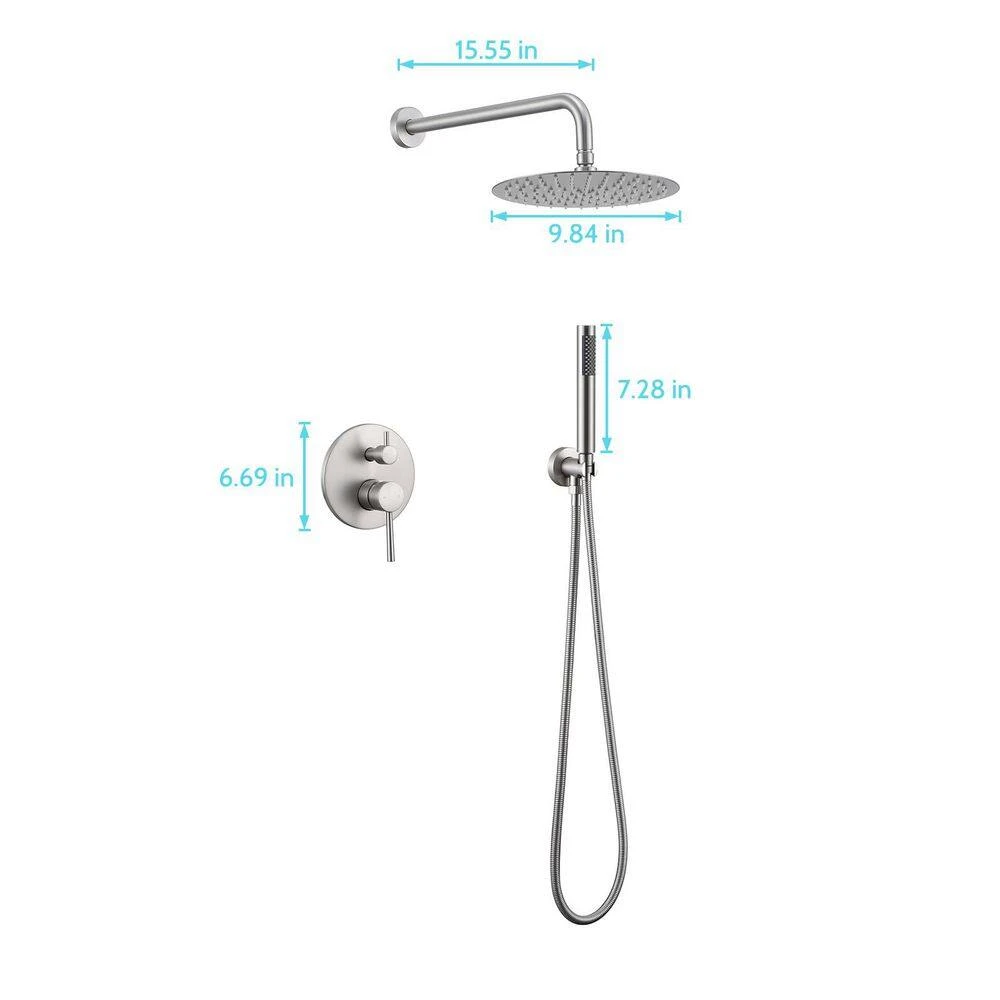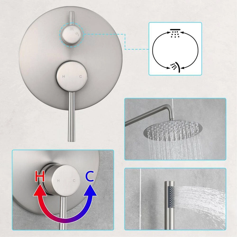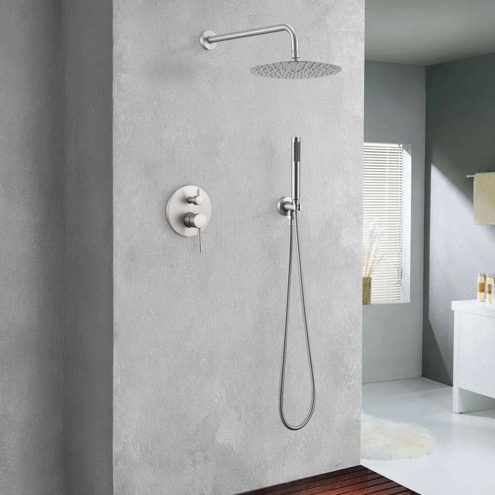 The shower head is wall-mounted at an ideal height, eliminating the need to twist, turn, or bend for a comfortable standing shower. Water from the shower head cascades over the entire body, offering a refreshing and natural bathing experience. Crafted from high-quality, durable brass and SUS 304 stainless steel, this stylish system includes both a shower and a hand shower. The diverter allows you to effortlessly switch between the shower and hand shower by turning the knob. Highlights: Rain showers and hand showers deliver a continuous and strong flow of water, even at low water pressure. The pressure balance valve’s filter element monitors and maintains water pressure balance, preventing scalding from sudden changes in hot or cold-water pressure. A 10 in. rain shower head and handheld shower head provide full body spray coverage, even in areas with low water pressure. The large shower head ensures complete body coverage and efficiently rinses lather from the body. Features an NPT œ in. connector, making it compatible with most existing shower systems.