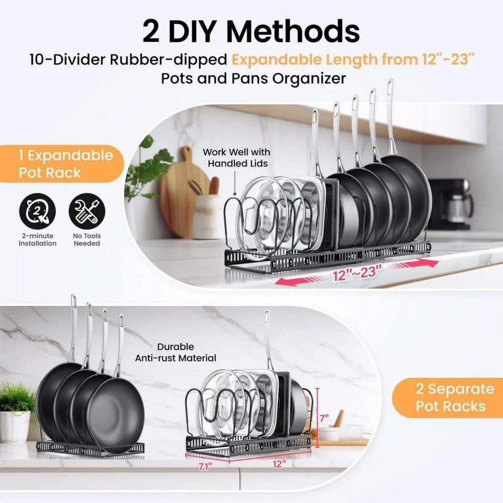 Our expandable pot and pan organizer rack helps free up kitchen cabinets, keeping countertops clutter-free while keeping essential cookware within easy reach, suitable for various sizes of pots, pans, and lids. Equipped with 10 M-shaped dividers, it provides a secure and tailored storage solution-these dividers are uniquely designed to hold lids in place, adapting to your organizational needs to create a tidy kitchen. It can stack up to 10 plus pans effortlessly, making it ideal for smaller kitchens, busy cooks, or anyone looking to reduce clutter, and is available in white, black, or bronze to complement your kitchen decor. The rack’s length is adjustable from 12 in. to 23 in. to fit your space perfectly; it can be used as a single, expansive rack or split into 2 separate pieces, offering secure and convenient storage that suits your kitchen layout. Backed by satisfactory service, we are committed to delivering top-quality products-if you encounter any issues with the rack, simply contact us for a replacement or refund.