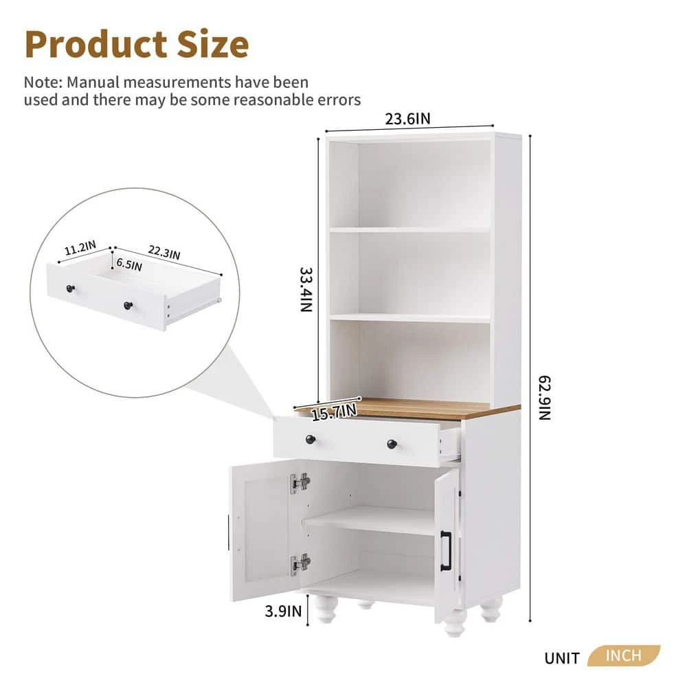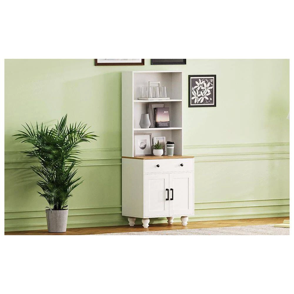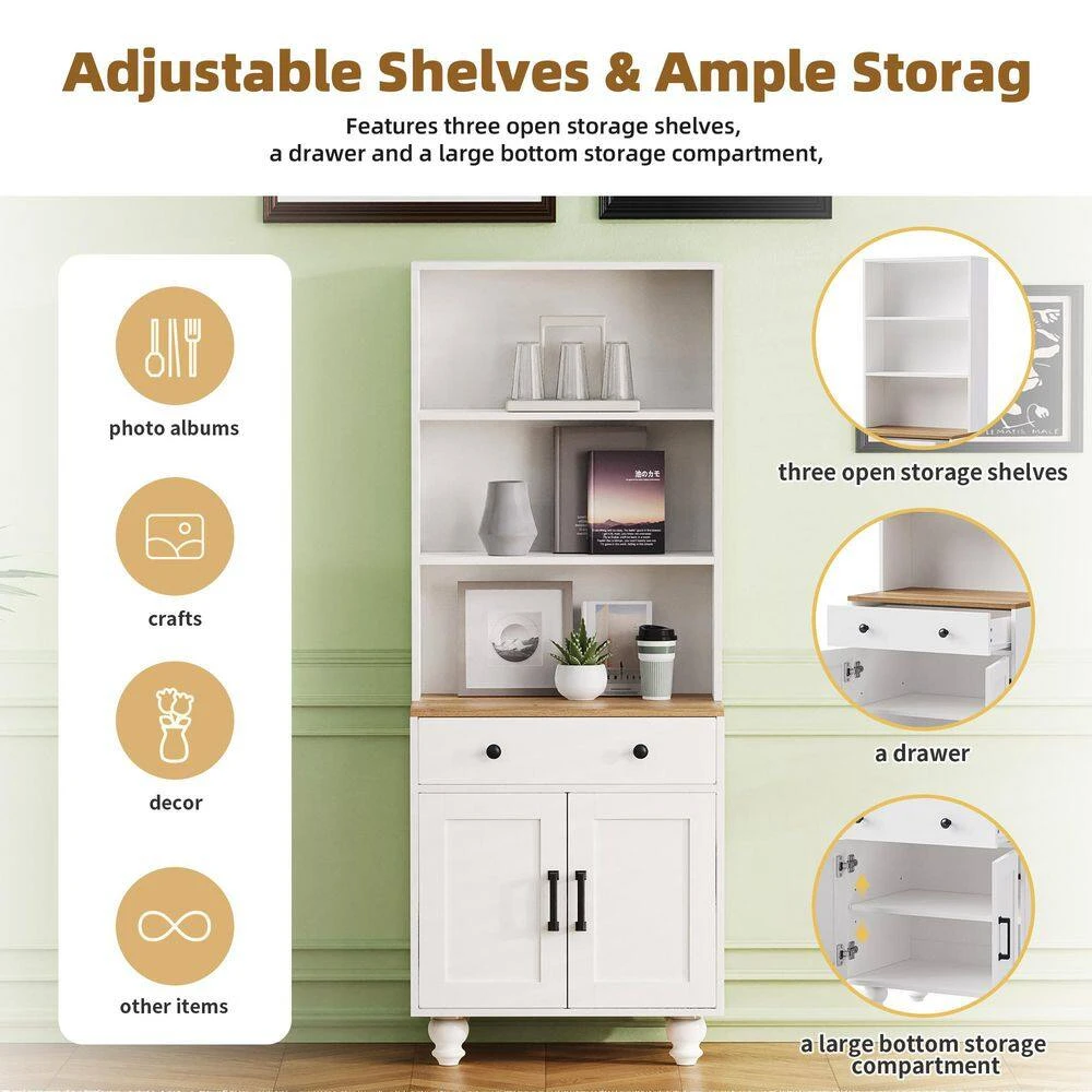 This farmhouse storage cabinet blends wood grain and solid white finishes, featuring vintage gourd-shaped solid wood legs and black retro handles to add classic elegance to farmhouse-style decor. With 3 open shelves, a drawer, and a large bottom cabinet (including an adjustable shelf), it offers versatile storage for books, tableware, decor, and more-ideal as a bookshelf, plant stand, or kitchen pantry. The anti-tip kit ensures safety for families, while the sturdy solid wood legs enhance stability and support heavy items. Its compact design and adaptable storage make it a functional and stylish addition to living rooms, kitchens, or any space needing organized charm.