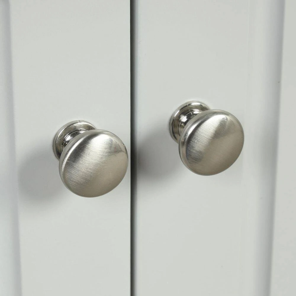 - Closed and organized storage: cabinet doors hide clutter while keeping items dry; brushed nickel knobs for easy opening/closing