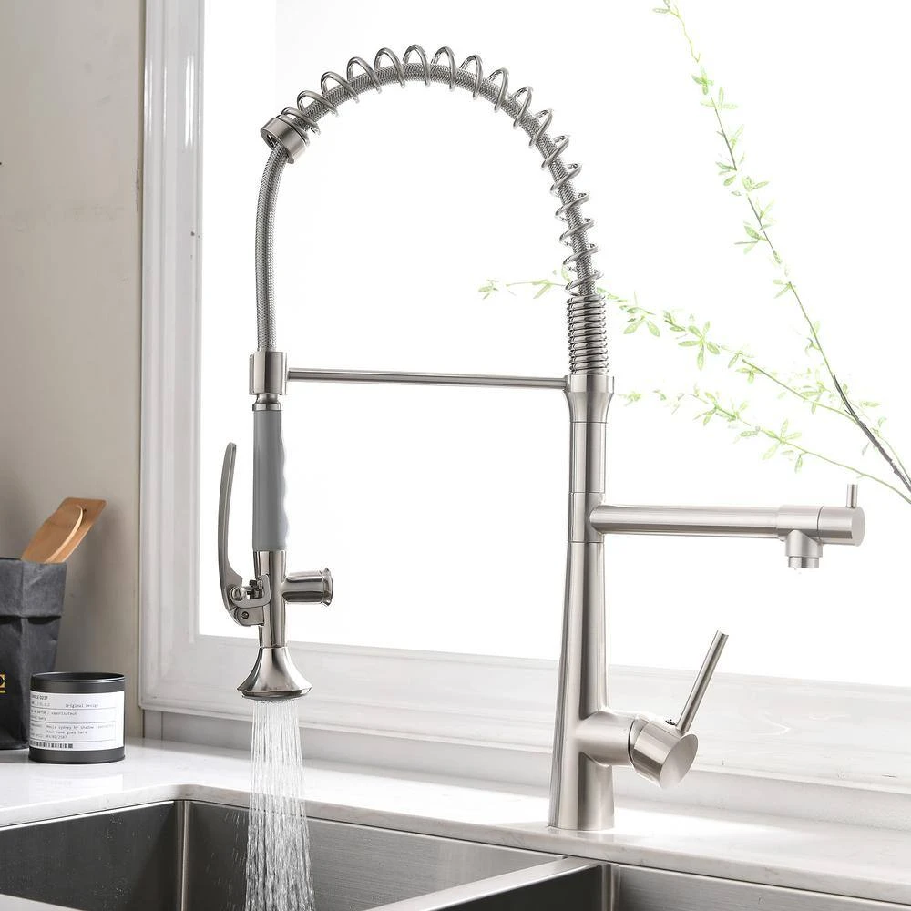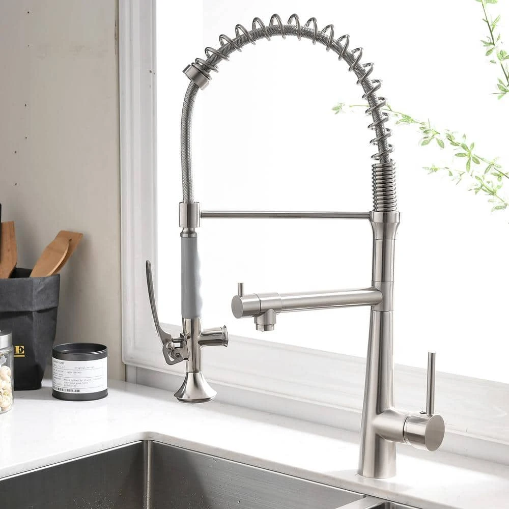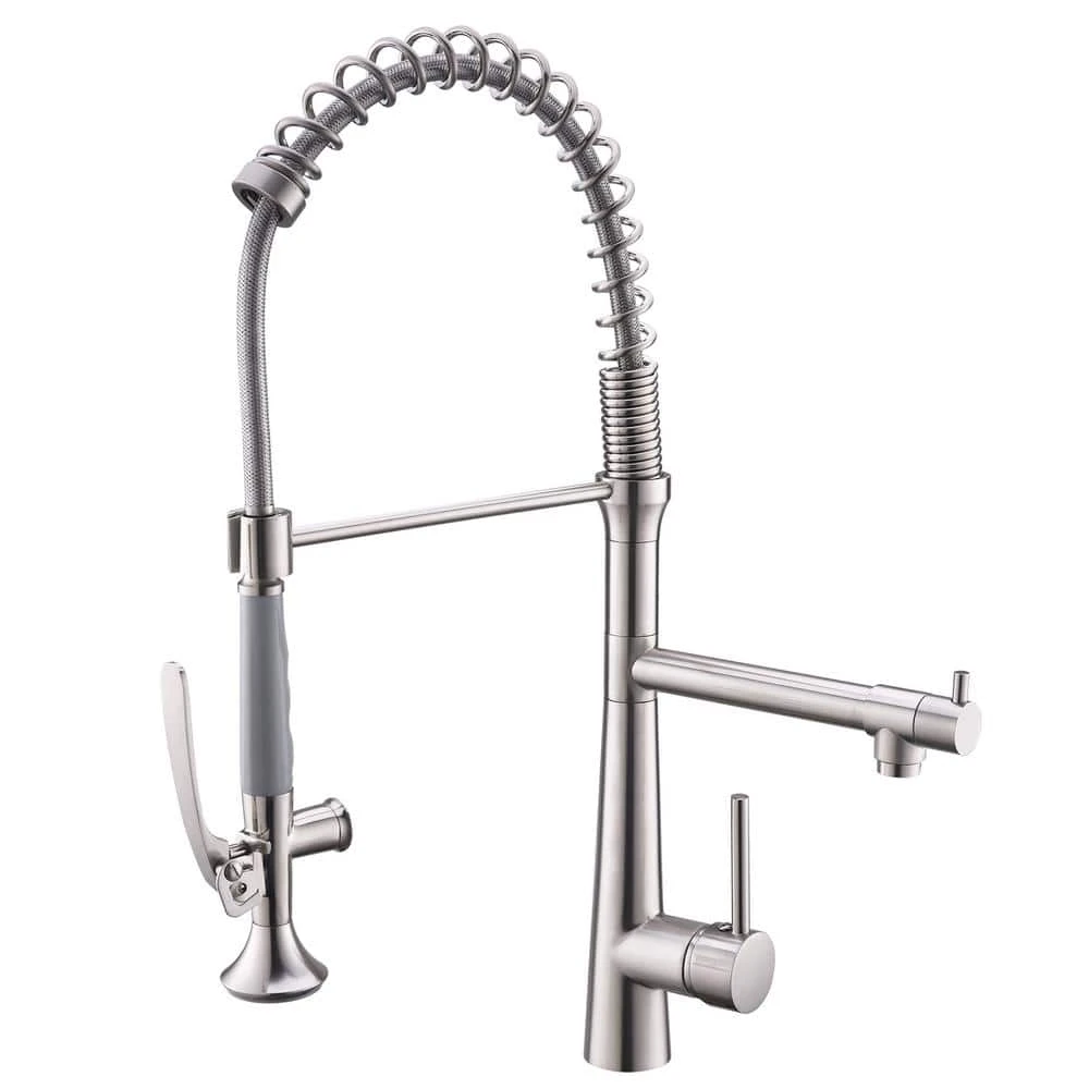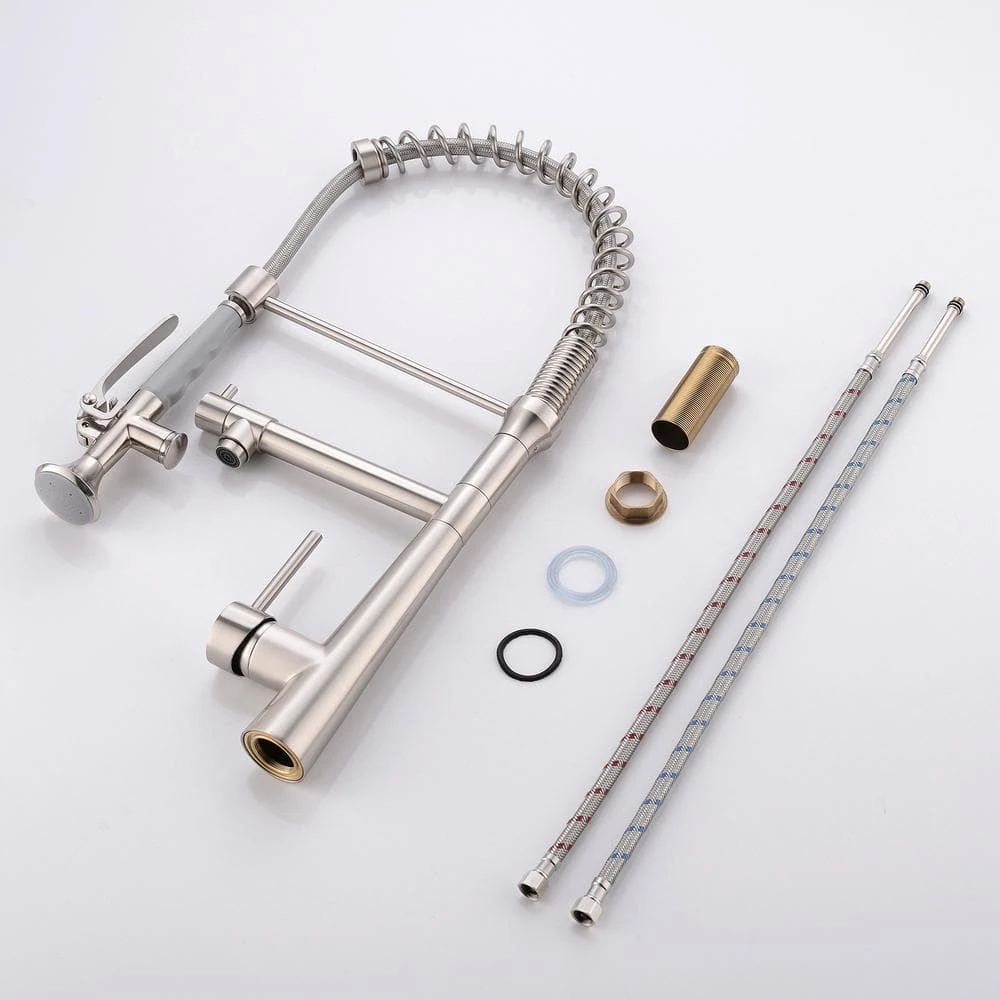 The Heavy Duty Commercial Style Kitchen Sink Faucet features a Spot Free-Brushed Nickel finish, constructed from solid brass for lead-free and superior rust-resistant durability. Its unique design incorporates a heavy-duty spring mechanism, perfect for large sinks or granite countertops. This faucet offers a dual-function spout, combining a commercial-style pre-rinse feature with a pull-down spring spout and a pot filler, both capable of 360° rotation and individually controlled for maximum convenience.