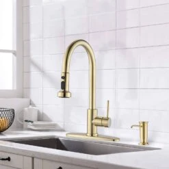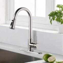 Single Handle Deck Mount Gooseneck Pull Down Sprayer Kitchen Faucet With Deckplate In Brushed Nickel