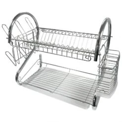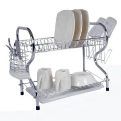 2-Tier Silver Chrome Standing Dish Rack With Plastic Draining Tray, Mug Stand, And Cutlery Holder