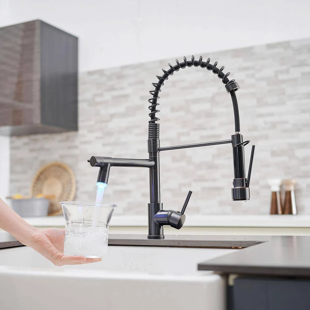 the ORB Kitchen Faucet with Pull Down Sprayer, a modern solution for your kitchen needs. This faucet combines functionality, safety and style seamlessly. with its swivel design, it reaches every corner of your sink, while the dual spouts cater to specific tasks – 1 delivers a powerful spray, the other a steady stream. The Buckle Lock feature allows you to lock the spray mode for focused washing and the hands-free operation adds convenience during dishwashing. Plus, LED lights indicate water temperature for added safety. Quick installation and durable construction make this faucet a reliable choice for your kitchen. Simplify your kitchen chores and enhance its aesthetic with this versatile and practical ORB Kitchen Faucet.