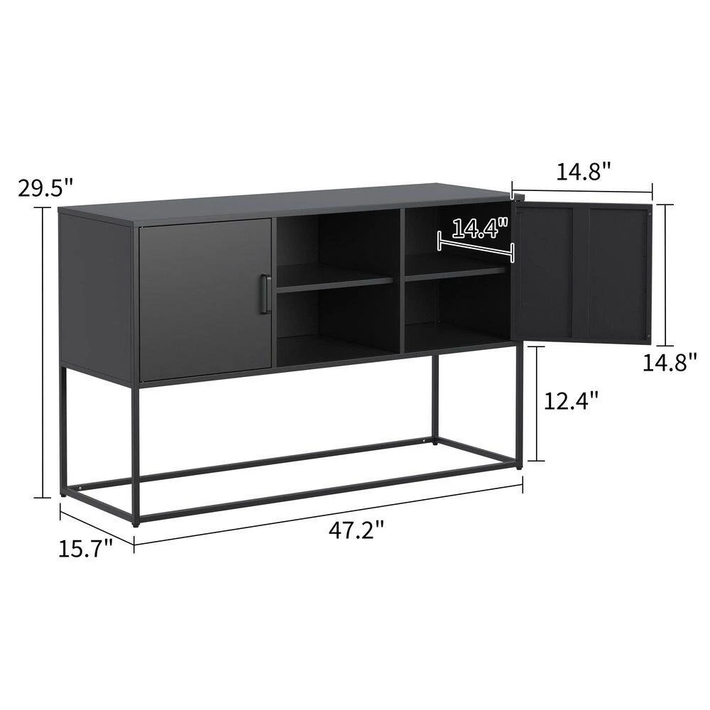 The Modern Sideboard Buffet Cabinet is a great storage option. Measuring 47.2 in. W x 15.7 in. D x 29.5 in. H with 6 compartments, it’s spacious and suitable for any room. Made of high strength cold rolled steel, it’s durable and rust resistant. The eco friendly powder coating is formaldehyde free, odorless, and easy to clean. It can be used as a sideboard, buffet, coffee bar, or TV stand. The high leg design aids maintenance, and the anti scratch feet protect floors. An anti tipping device ensures safety. With an elegant handle and magnetic silent closure, it looks sleek. It’s easy to assemble with provided instructions, gloves, and a screwdriver, and you can scan to watch an installation video.
