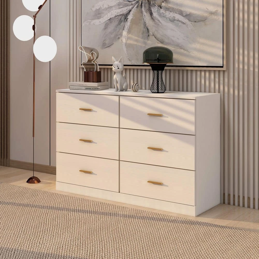This Classic 2 – Column 6 – Drawer Dresser is a remarkable addition to any home. Its simple style, accentuated by black handles, brings a touch of modern elegance to your bedroom. Thanks to its classic design, it can seamlessly complement any decor style, making it an incredibly versatile piece of furniture. When it comes to storage, the dresser truly shines. With 6 spacious drawers, it provides ample room to neatly store your clothes, bedding, and other essentials, helping you keep your bedroom clutter – free. Crafted from high – quality particle board, this dresser is not only sturdy but also safe for everyday use. The waterproof surface ensures its durability over time, while the smooth texture adds a touch of sophistication. Versatility is another of its strong suits. This 6 – drawer dresser is perfect not only for bedrooms but also for closets, living rooms, or even as an entry table. It offers the necessary storage space for all your clothing and accessories, adapting to different areas of your home. Assembly is a breeze. All marked parts and the assembly tools are included in the package, along with a detailed assembly manual. Whether you have a large bedroom or a cozy space, this dresser is designed to fit seamlessly into any bedroom size or layout. Upgrade your bedroom with this Classic 2 – Column 6 – Drawer Dresser today and experience the perfect blend of style, functionality, and durability.