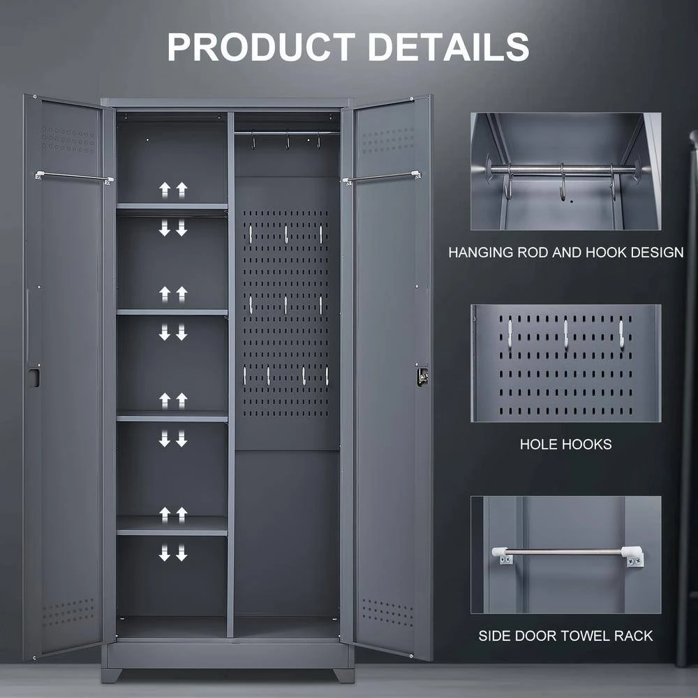 This heavy – duty storage cabinet is built tough. Made wholly of high – quality steel with a reinforced internal frame, it’s strong, stable, and can bear heavy loads. Its anti – corrosion and anti – rust treated surface ensures a long lifespan.The storage system has hanging rods and shelves, perfect for hanging tools, clothes, etc. It suits garage storage, like for cleaning tools, or as an office cabinet in the basement.Our broom closet – style cabinets have holes at the bottom to stop water pooling, so wet items can be stored safely. Ventilation holes on the door keep things dry and breathable.This locking – door metal cabinet comes with detailed instructions and installation videos for easy assembly. If you have any questions, our professional staff are just a message away to assist you. It’s a great all – around storage solution for various needs.