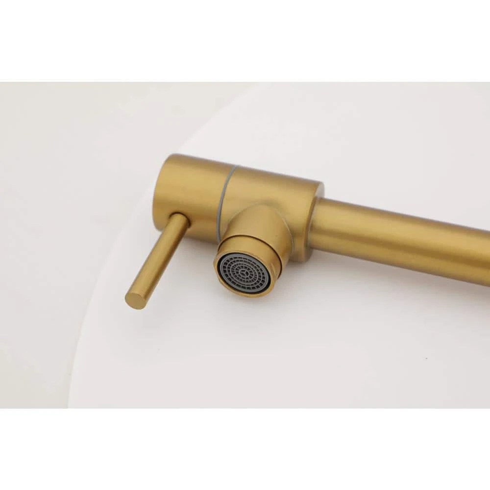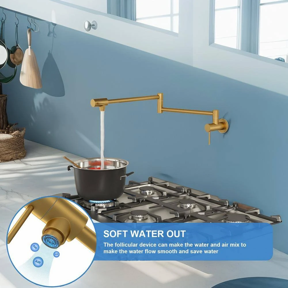This pot filler kitchen faucet epitomizes modern design, making it a stylish and functional addition to any contemporary home. Constructed from durable solid brass with a lead-free construction for both the faucet body and handles, it ensures reliability and safety. The premium materials used not only provide a robust structure but also contribute to its commercial-grade appearance, blending elegance with durability. The faucet features 2-ceramic disc shut-off valves that offer a smooth turning action and effectively prevent drips, ensuring long-lasting performance and ease of use. Its double-jointed spout extends up to 19.88 in., providing flexibility and convenience for filling large pots directly at the wall, while retracting neatly when not in use to maintain a tidy kitchen space. This stretchable wall-mounted pot filler leaves ample counter space for preparation work, enhancing kitchen efficiency. Designed for wall mounting with a single hole and internal thread (1/2 in. – 14 NPT inlet), this faucet integrates seamlessly into various kitchen setups. It has a maximum flow rate of 1.75 GPM, delivering sufficient water pressure for efficient filling. With primary materials comprising brass and stainless steel, along with 2-handles for precise control over water flow and temperature, this pot filler is both a practical and aesthetically pleasing choice for any modern kitchen.