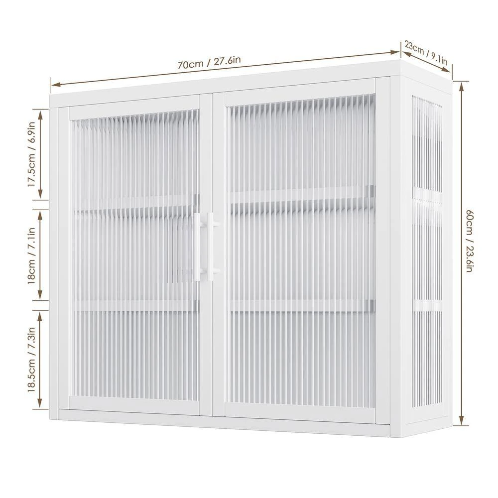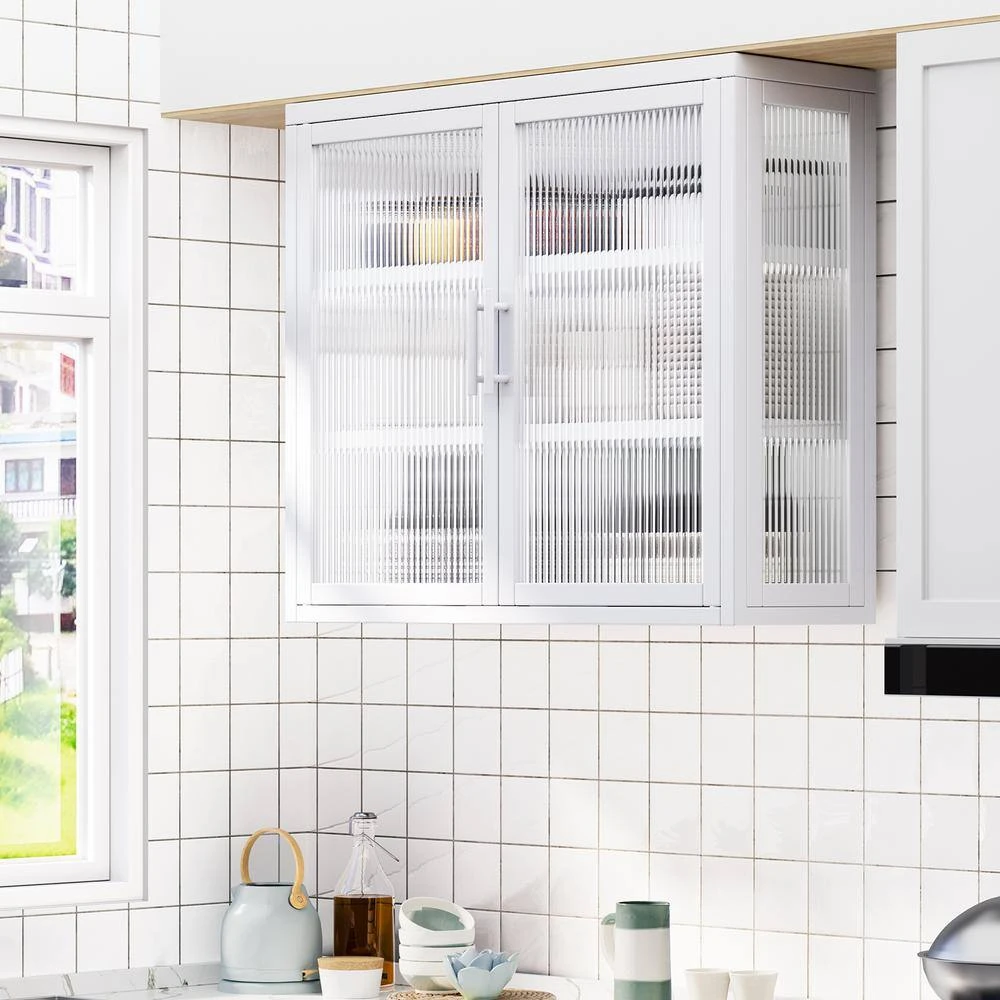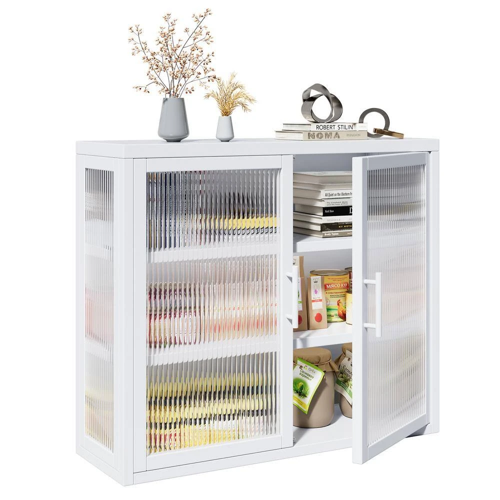 This stylish wall cabinet offers a flexible storage solution with 2-adjustable interior shelves, allowing you to reduce clutter and maintain a tidy home or office environment. It’s suitable for various rooms including the living room, kitchen, dining room, and more. The top of the cabinet also provides additional space for displaying items. Constructed from premium quality cold-rolled steel, fluted tempered glass, and finished with electrostatic powder coating, this cabinet is designed to resist water, rust, erosion, and scratches, providing a strong load-bearing capacity and ensuring long-term durability. Each shelf can support up to 20kg/44.1lbs. The glass doors are crafted from durable engineered steel and fluted tempered glass, featuring elegant handles for smooth operation. The retro-inspired color scheme and modern design elements, such as the solid metal legs, effortlessly blend into any decor while offering excellent light transmission without being transparent. Upgraded details include non-slip pads on the metal legs to protect your floors and anti-tipping spare parts for added safety when attaching the cabinet to the wall.
