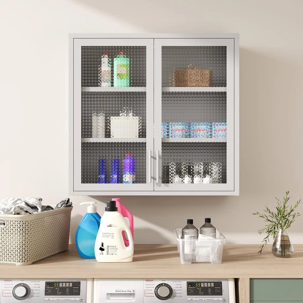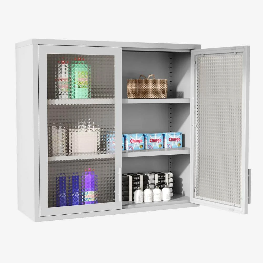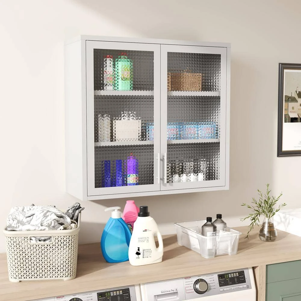 This wall-mounted or countertop cabinet stands out with its outdoor powder coating finish, offering superior weather resistance, corrosion resistance, and waterproofing compared to ordinary coatings. Constructed from cold-rolled steel, it ensures sturdiness and durability with a high load-bearing capacity of up to 15kg/33 lbs. per layer. The reinforced tempered glass doors, certified by 3C, add safety while the materials used are formaldehyde-free and recyclable, promoting a healthier and more environmentally friendly option. Designed for versatile use, this cabinet can be installed on walls or placed on countertops to maximize storage space in various rooms such as the living room, kitchen, bathroom, laundry room, or office. Its retro style, highlighted by hazy and aesthetic waffle-grid glass doors, adds an artistic touch to any space. With dimensions of 31.5 in. W x 11.8 in. D x 30 in. H, this cabinet offers enlarged storage capacity compared to similar items. Additional features include two adjustable shelves for customizable storage solutions, silicone door stoppers to minimize noise, and ergonomically positioned handles for easy access. Installation is straightforward, guided by detailed instructions, and our customer service team is ready to assist with any questions or after-sales support.