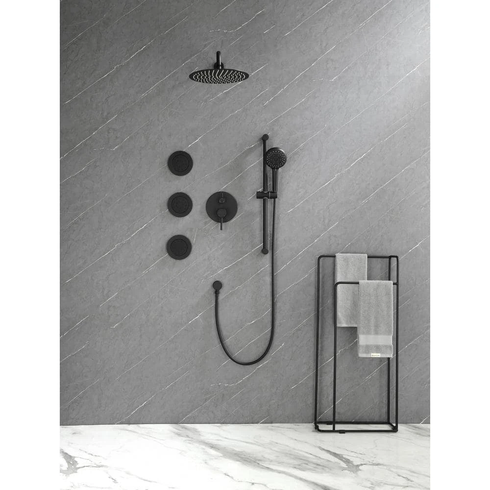 - Comprehensive package: includes shower head, hand shower, slide bar, shower arm, hose, valve trim, wall supply, body spray and rough-in