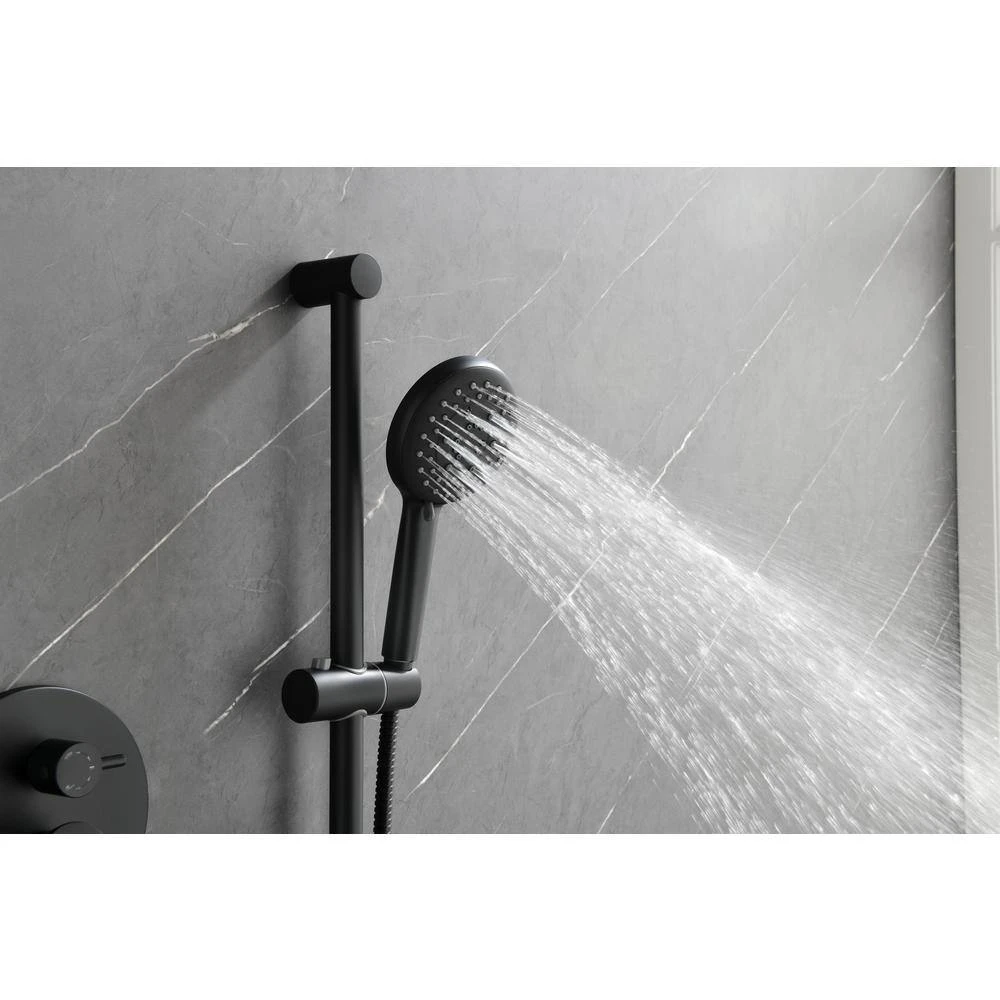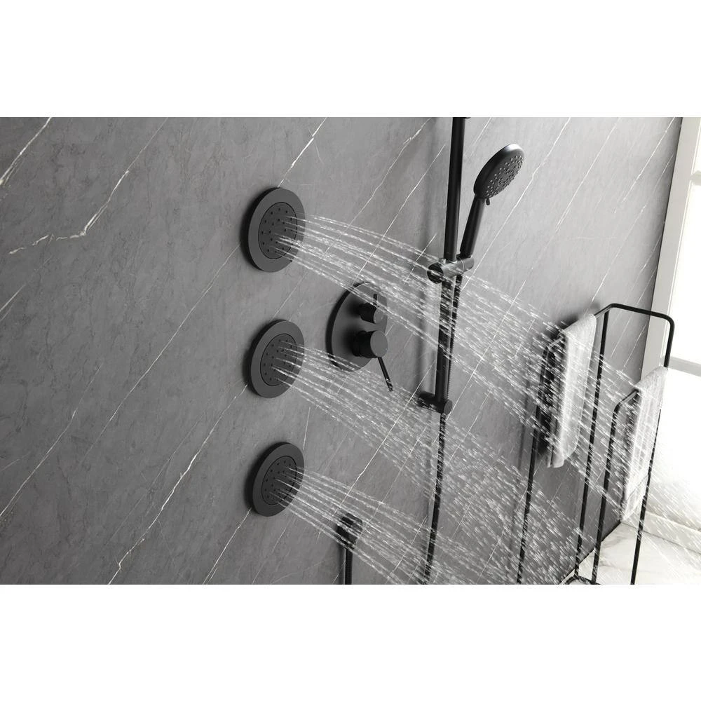This comprehensive shower package includes a shower head, hand shower, slide bar, shower arm, hose, valve trim, wall supply, body spray and rough-in. It features dual cartridges that control water temperature and volume independently, with 3-body sprays included. The system comes with 2-lever-style metal handles and independent diverter controls offering 3-shower functions. The slide bar and matching hand shower with pause control and a 60 in. hose provide additional convenience. The high-quality finish resists rust and corrosion through everyday use. The single function shower heads offer a full spray with easy-clean silicone nozzles, while the hand shower provides multiple spray options, including full spray, massage spray, aerated spray, full and massage spray and full and aerated spray.