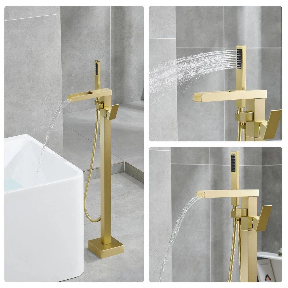 The main body of the bathtub faucet and the hand shower hose are crafted from high-quality stainless steel, ensuring durability and a long service life. Highlights include a modern waterfall spout design that seamlessly integrates with the faucet for a beautiful aesthetic. The multipurpose hand shower features a 59 in. stainless steel hose, known for its durability, corrosion resistance, and easy installation. Lever handles are designed for effortless water flow and temperature adjustments. The faucet comes with rough machining and all necessary mounting hardware for floor bolting, ensuring stability and facilitating a safe and efficient installation process. Additionally, the handheld shower with its hose is ideal for rinsing off after a bath or for bathroom cleaning tasks.