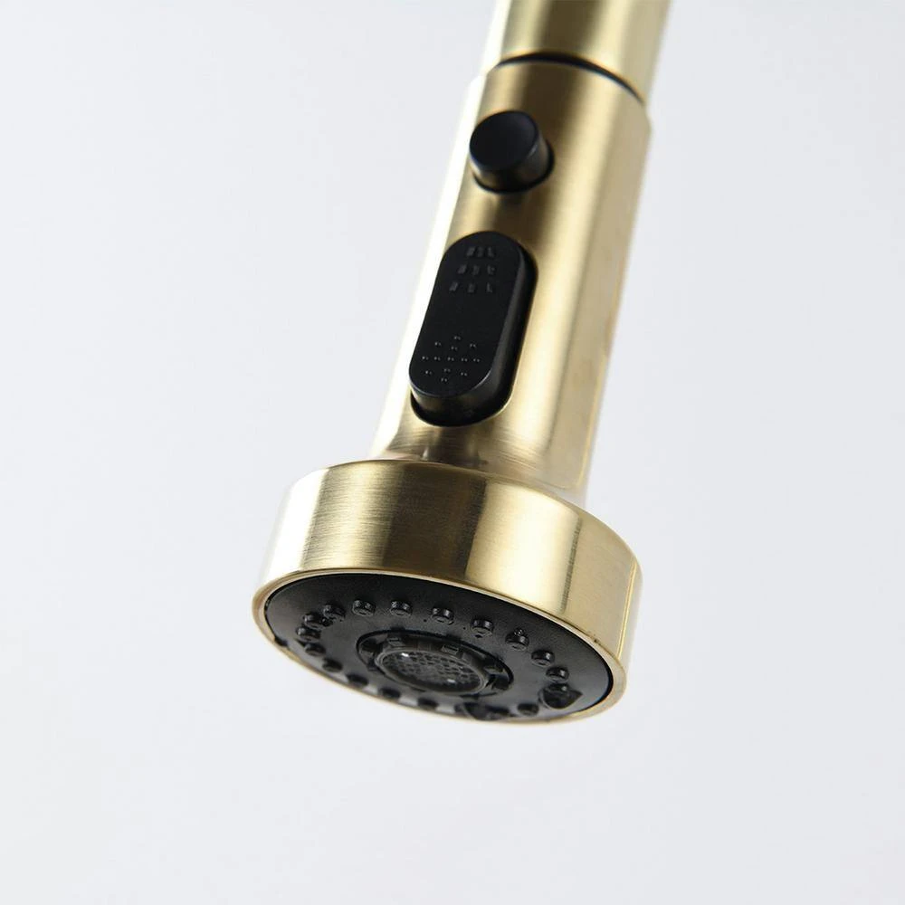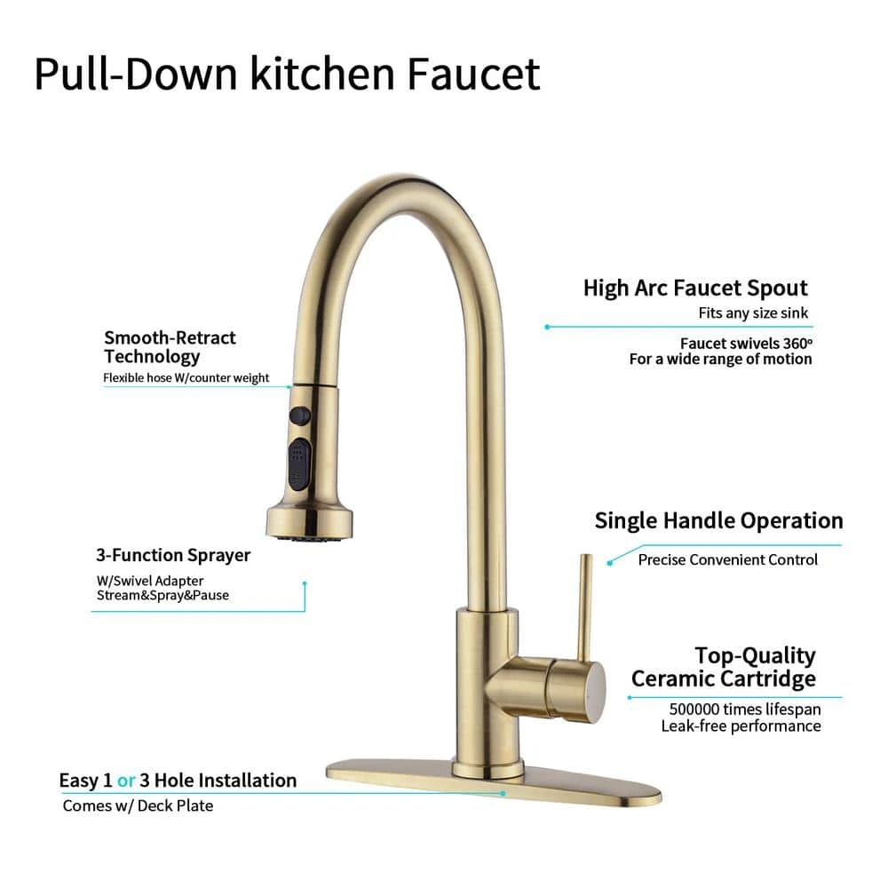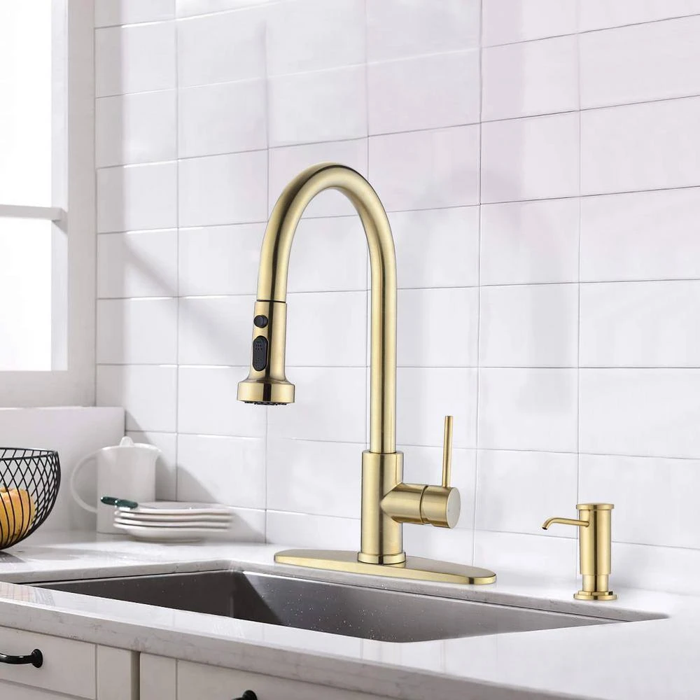 Single Handle Deck Mount Gooseneck Pull Down Sprayer Kitchen Faucet With Deckplate And Soap Dispenser In Brushed Gold