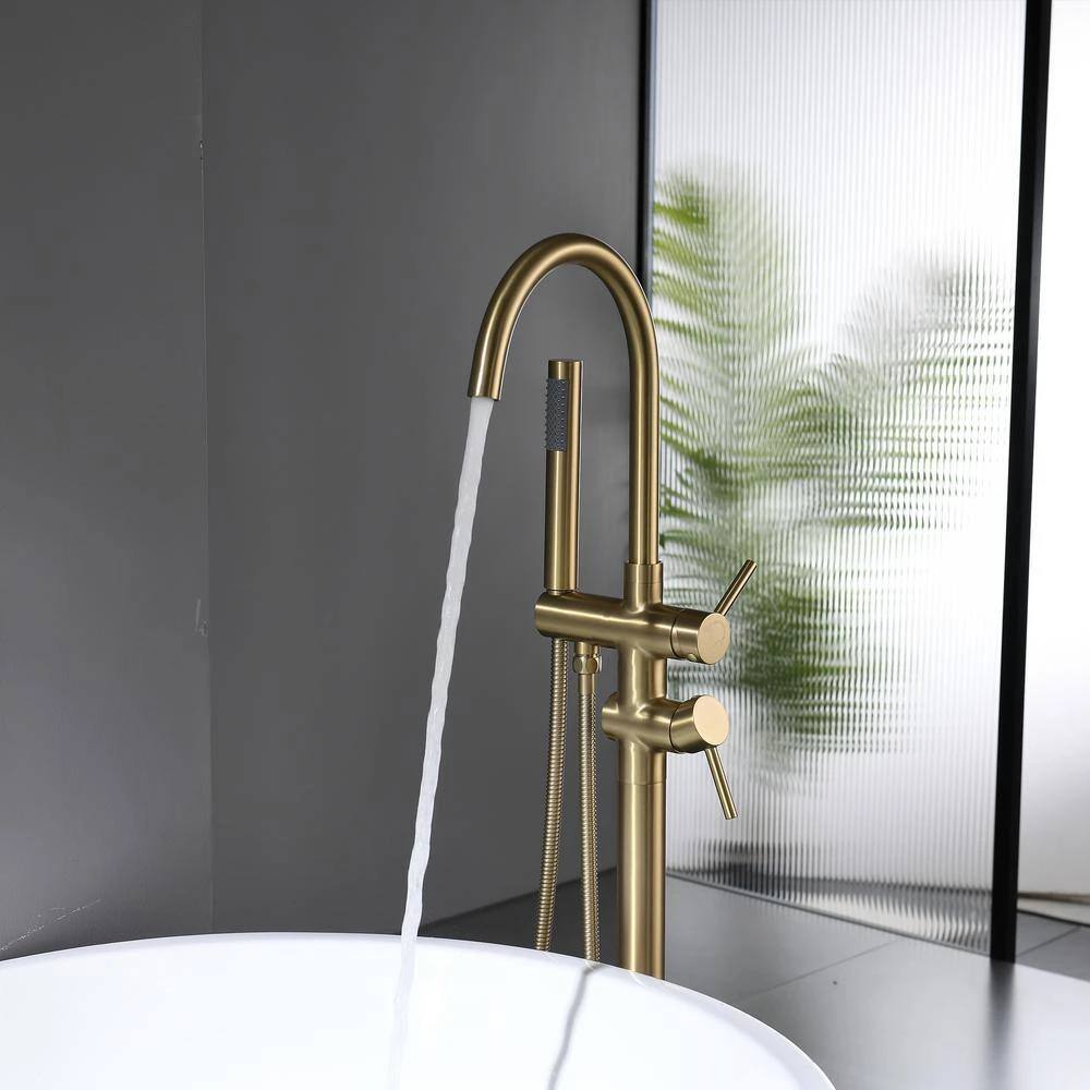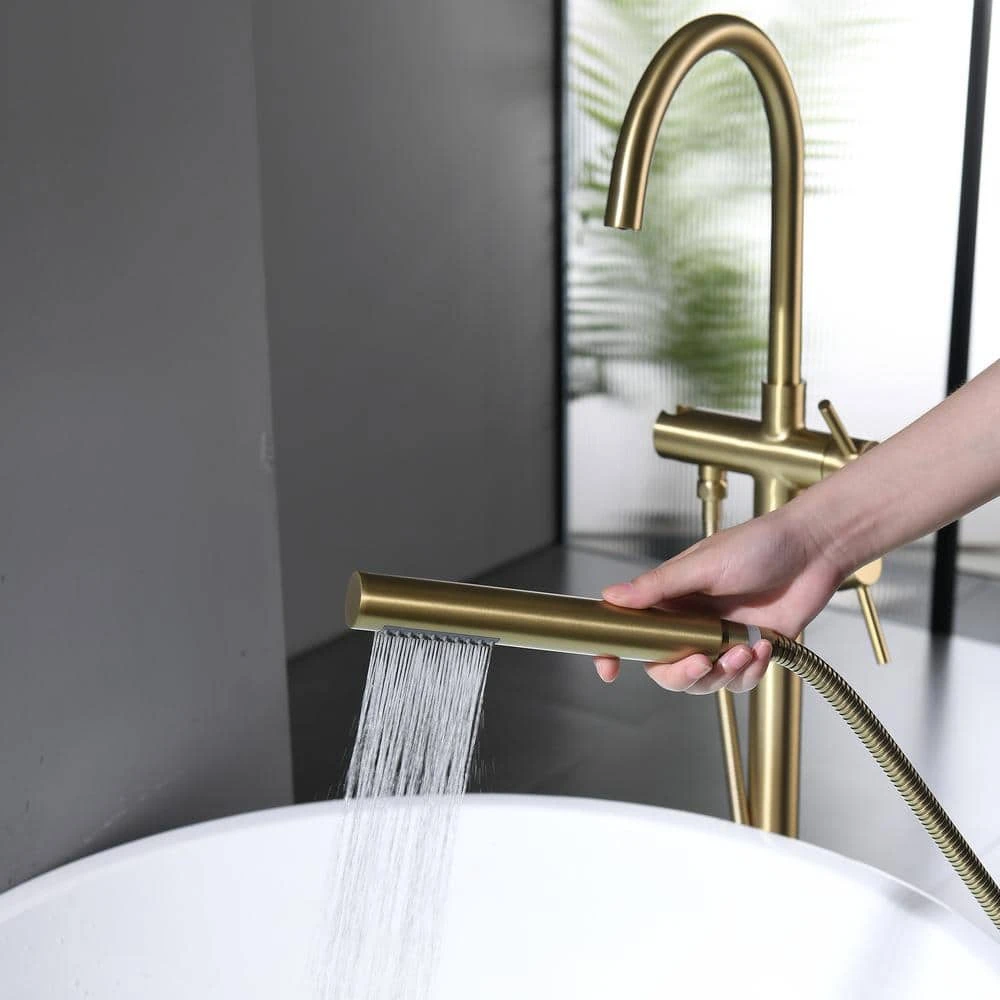 - Floor-standing faucet with hand shower is perfect for rinsing, washing pets or keeping your tub clean