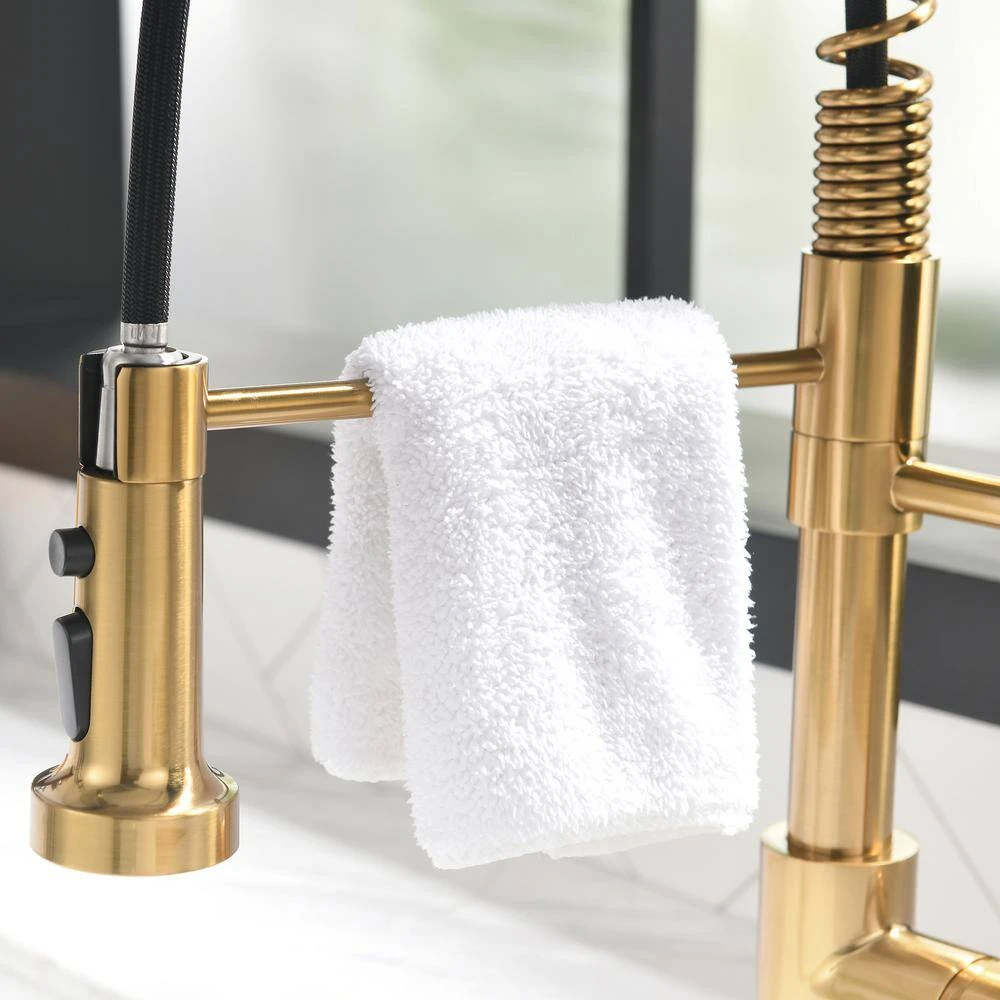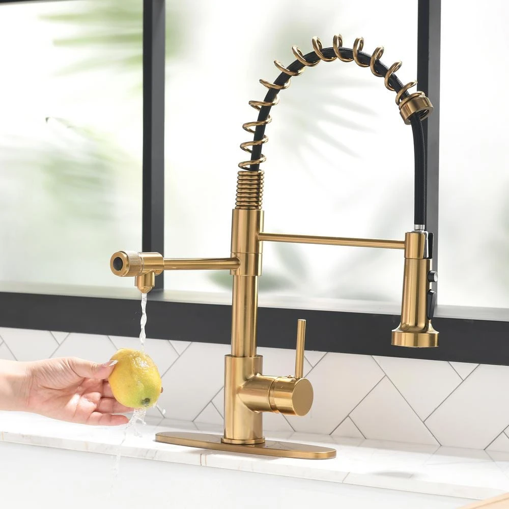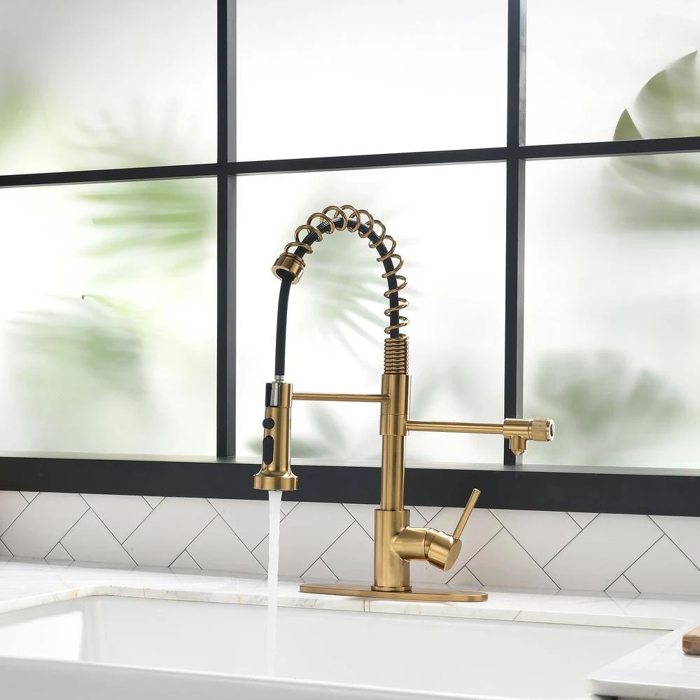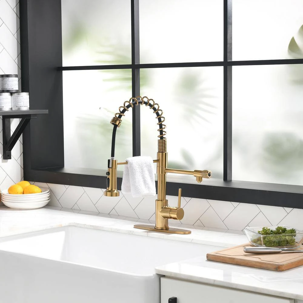 The kitchen faucet without deck plate creates a captivating industrial look with a high-arc open coil spout and offers the advantage of a compact height that fits underneath most kitchen cabinets. Our pull down kitchen faucet features a high-quality, sturdy brass body. High-tech surface technology, heavy-duty open coil spring and a superior-grade ceramic cartridge that tested over 500,000 cycles to ensure lasting leak-free use.