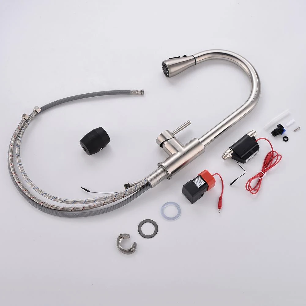 The Touch-On Kitchen Faucet with Pull Down Sprayer is a single-handle brass kitchen sink faucet that features advanced automatic water-saving technology. Unlike traditional kitchen faucets, this model is controlled by touching the high-arc goose neck spout or body, and it automatically turns off after three minutes if forgotten. It offers three water output modes, including STREAM for filling water and SPRAY for rinsing, and comes with complete tool accessories for easy installation. The faucet is made of brushed nickel and is compatible with US standard 3/8