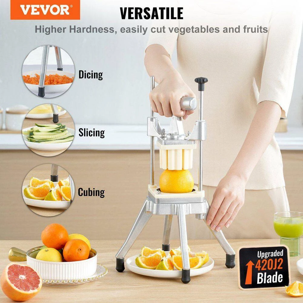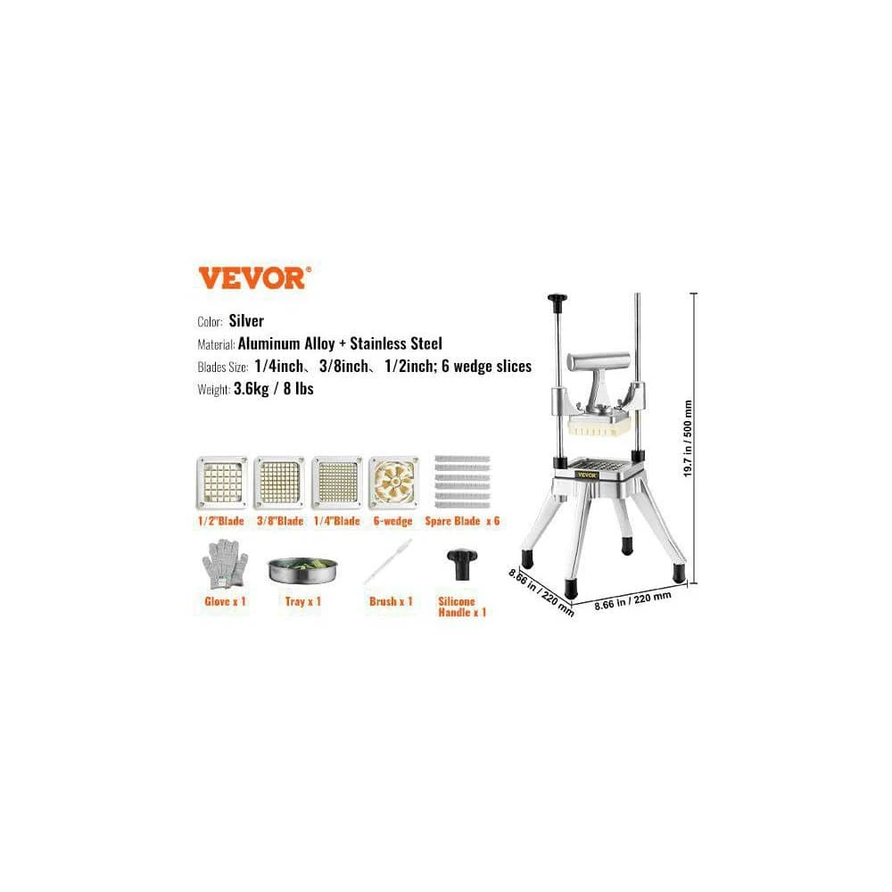 This commercial vegetable chopper is durable and hygienic, made of heavy-duty stainless steel, aluminum alloy, and food-grade 420J2 stainless steel blades-resisting corrosion and extending service life while ensuring safe food contact. It comes with four sharp, sturdy blades (1/2